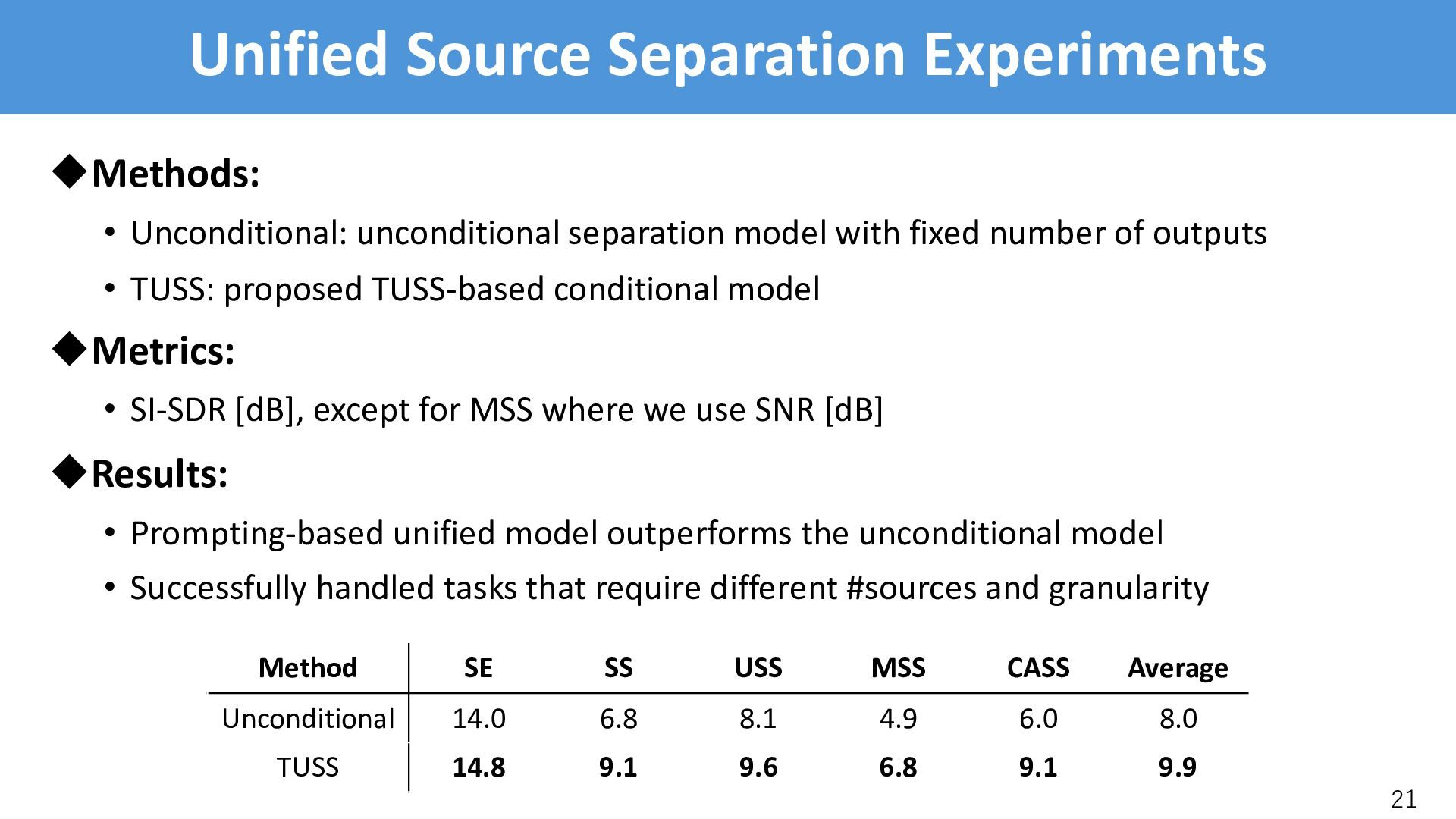 20. Unified Source Separation Experiments uMethods: • Unconditional: unconditional separation model