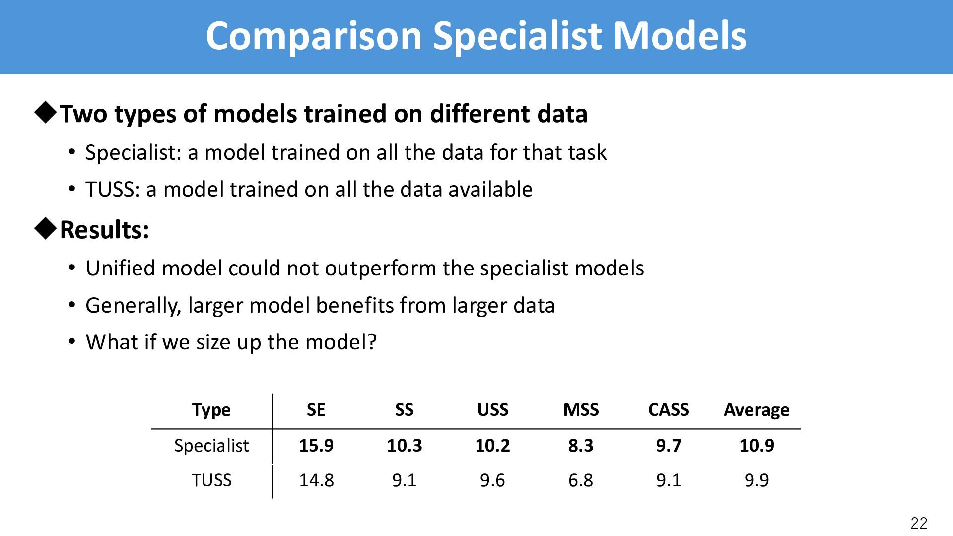 data • Specialist: a model trained on all the data for that task • TUSS: a model trained on all the data available uResults: • Unified model could not outperform the specialist models • Generally, larger model benefits from larger data • What if we size up the model? 22 Type SE SS USS MSS CASS Average Specialist 15.9 10.3 10.2 8.3 9.7 10.9 TUSS 14.8 9.1 9.6 6.8 9.1 9.9