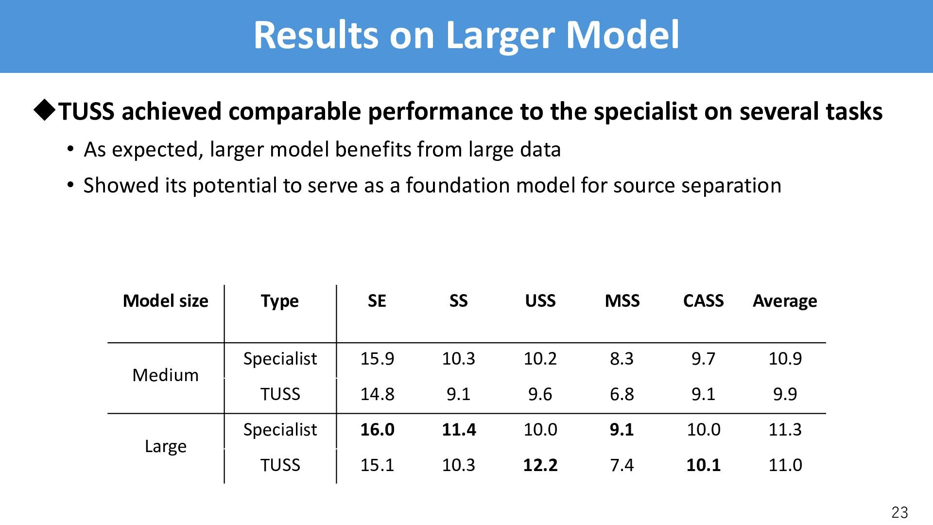 specialist on several tasks • As expected, larger model benefits from large data • Showed its potential to serve as a foundation model for source separation 23 Model size Type SE SS USS MSS CASS Average Medium Specialist 15.9 10.3 10.2 8.3 9.7 10.9 TUSS 14.8 9.1 9.6 6.8 9.1 9.9 Large Specialist 16.0 11.4 10.0 9.1 10.0 11.3 TUSS 15.1 10.3 12.2 7.4 10.1 11.0