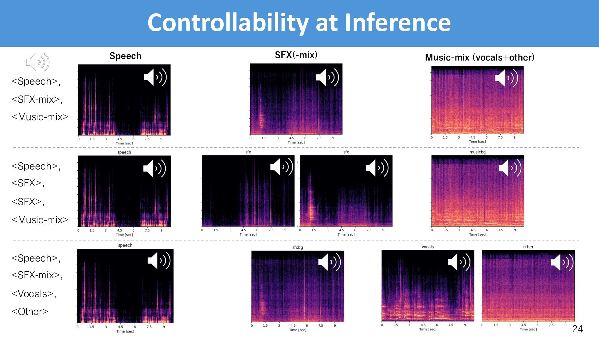 23. Controllability at Inference 24 Speech SFX(-mix) Music-mix (vocals+other) <Speech>, <SFX-mix>,
