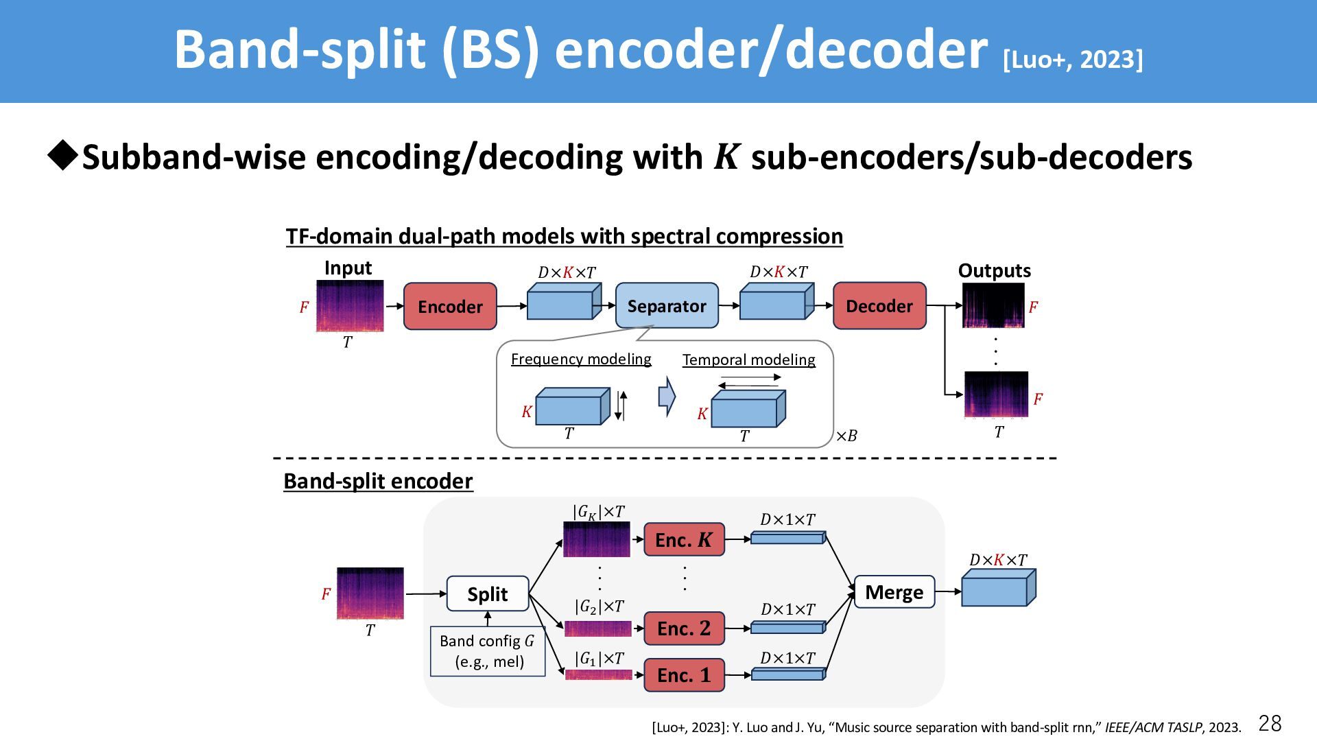 27. Band-split (BS) encoder/decoder [Luo+, 2023] uSubband-wise encoding/decoding with # sub-encoders/sub-decoders