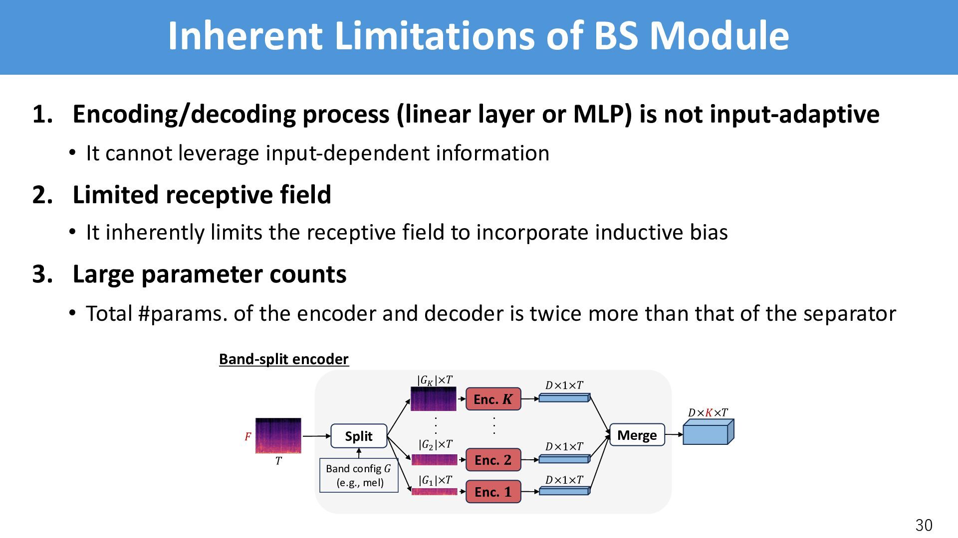or MLP) is not input-adaptive • It cannot leverage input-dependent information 2. Limited receptive field • It inherently limits the receptive field to incorporate inductive bias 3. Large parameter counts • Total #params. of the encoder and decoder is twice more than that of the separator 30 Encoder Separator ・ ・ ・ Input Outputs ! " #×%×! ! " Decoder Split ・ ・ ・ Enc. ! Enc. " Enc. # ・ ・ ・ Merge Band-split encoder #×%×! ! " #×1×! |(! |×! #×%×! |(" |×! #×1×! #×1×! |(# |×! ! % ! % Frequency modeling Temporal modeling ×) Band config ( (e.g., mel) " TF-domain dual-path models with spectral compression
