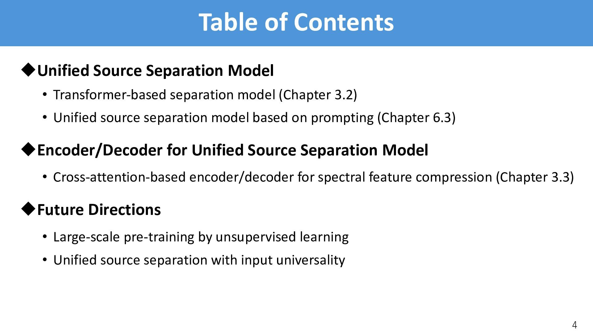 4. Table of Contents uUnified Source Separation Model • Transformer-based separation