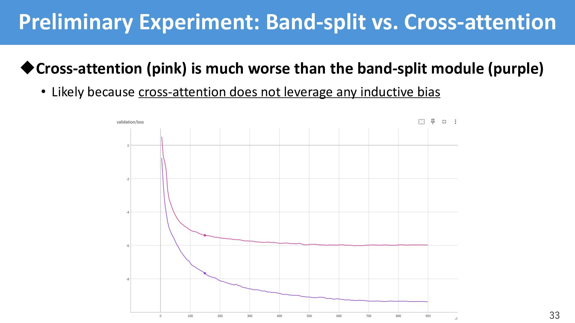 32. Preliminary Experiment: Band-split vs. Cross-attention uCross-attention (pink) is much worse