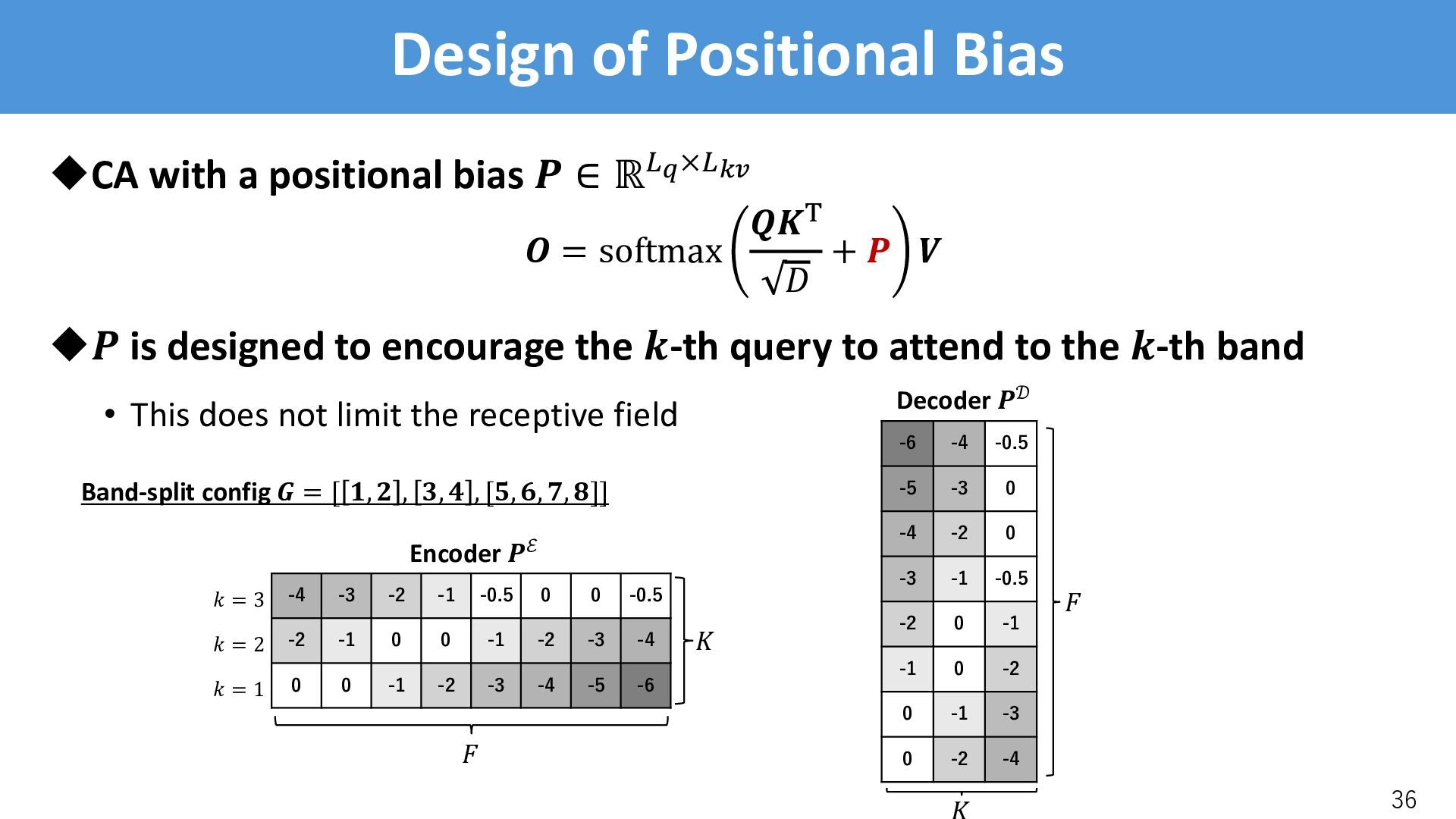 /-th encoder/decoder is in charge of the /-th band uCross-attention • The /-th query is in charge of to /-th band • Needs to learn where the /-th should attend, but the model failed uSolution • Incorporate psychoacoustically motivated inductive bias in cross-attention • Reformulate CA with a positional bias * ∈ ℝ)"×)#$ [Press+, 2022] CrossAttention(:, <, =): = softmax :<* ! + * = [Press+, 2022]: O. Press, et. al., “Train short, test long: Attention with linear biases enables input length extrapolation,” in Proc. ICLR, 2022.