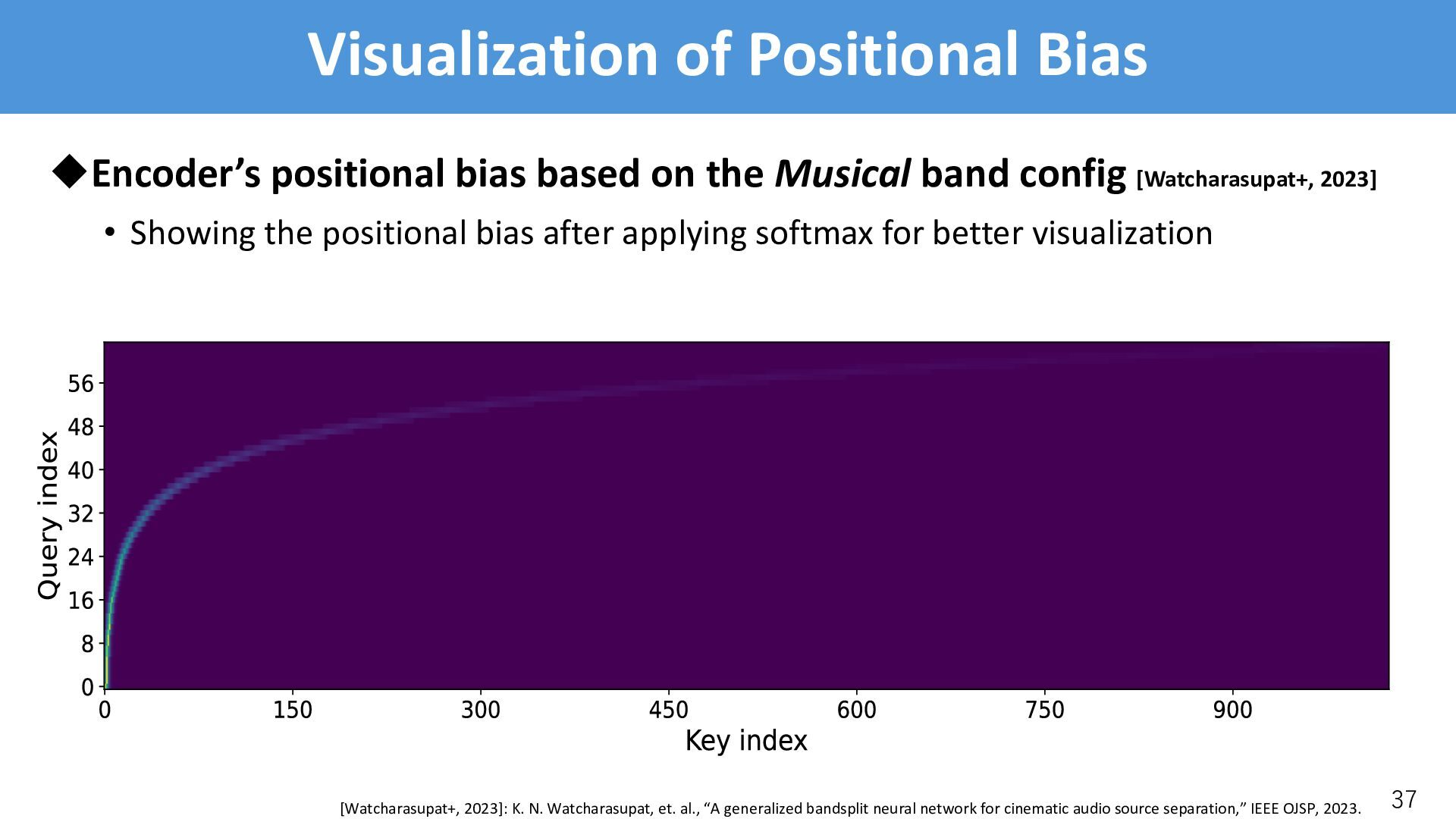 Musical band config [Watcharasupat+, 2023] • Showing the positional bias after applying softmax for better visualization 37 [Watcharasupat+, 2023]: K. N. Watcharasupat, et. al., “A generalized bandsplit neural network for cinematic audio source separation,” IEEE OJSP, 2023.