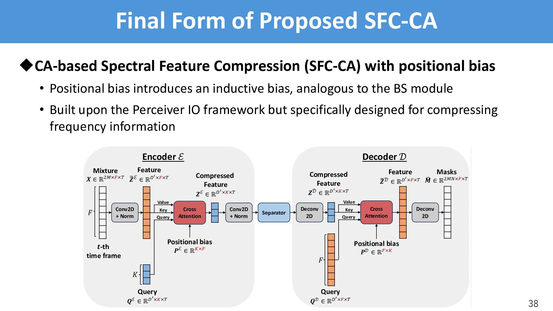 with positional bias • Positional bias introduces an inductive bias, analogous to the BS module • Built upon the Perceiver IO framework but specifically designed for compressing frequency information 38 Feature ! "ℰ ∈ ℝ!!×#×$ Query %ℰ ∈ ℝ!!×&×$ Encoder ℰ Conv2D + Norm Conv2D + Norm Mixture & ∈ ℝ'(×#×$ ! " Compressed Feature !ℰ ∈ ℝ!!×&×$ Cross Attention Key Query Value Positional bias 'ℰ ∈ ℝ&×# Separator Compressed Feature !" ∈ ℝ!!×&×$ Query %) ∈ ℝ!!×#×$ Deconv 2D ! Cross Attention Key Query Value Positional bias ') ∈ ℝ#×& Deconv 2D Feature ! "" ∈ ℝ!!×#×$ Decoder " Band config # = Posi Encoder 0ℰ ∈ ℝ#× " ! -0.5 -1 -2 -3 -4 -1 0 0 -1 -2 -3 -2 -1 0 0 Masks ( ) ∈ ℝ'(*×#×$ 3-th time frame