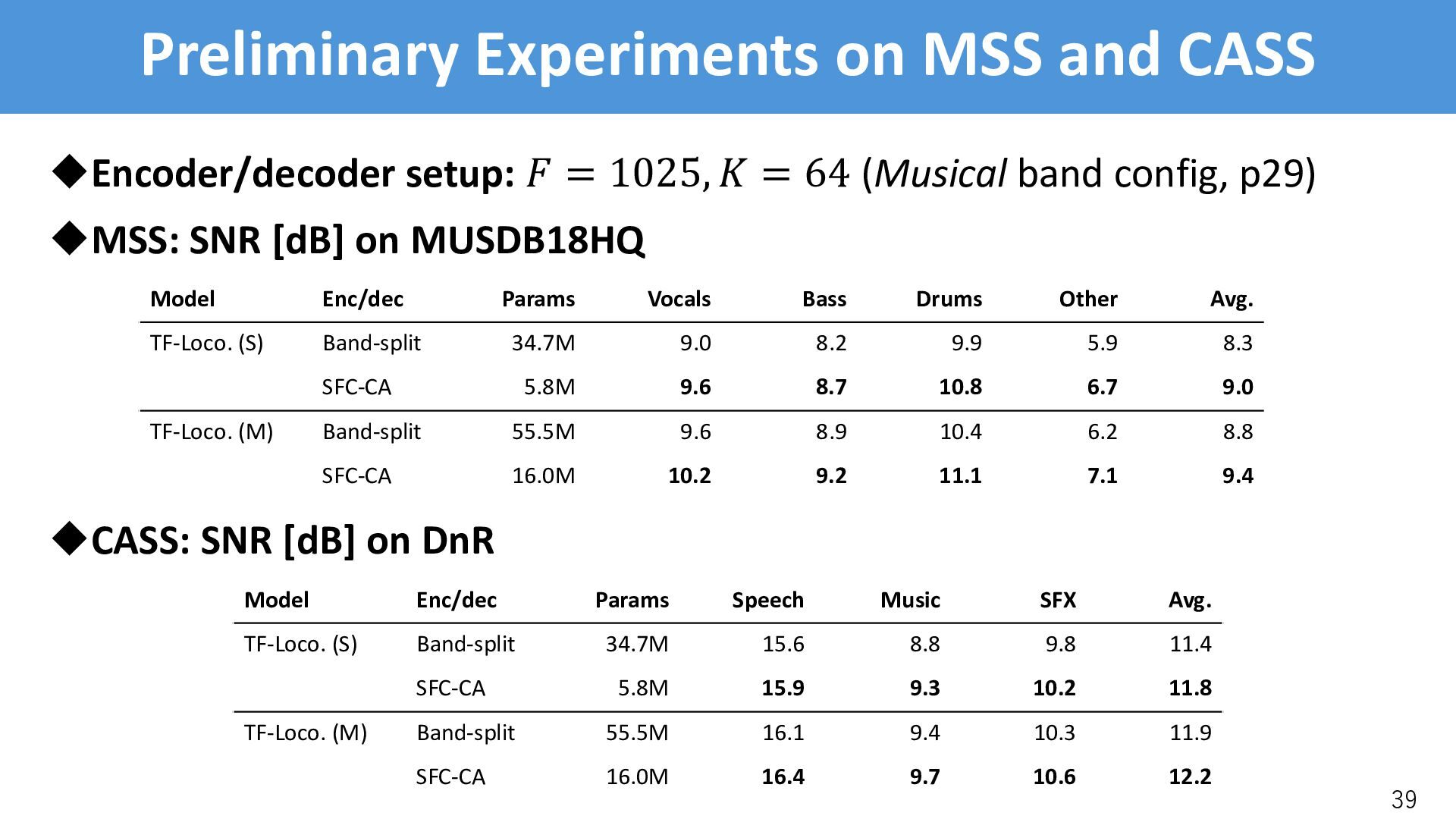 1025, 3 = 64 (Musical band config, p29) uMSS: SNR [dB] on MUSDB18HQ uCASS: SNR [dB] on DnR 39 Model Enc/dec Params Vocals Bass Drums Other Avg. TF-Loco. (S) Band-split 34.7M 9.0 8.2 9.9 5.9 8.3 SFC-CA 5.8M 9.6 8.7 10.8 6.7 9.0 TF-Loco. (M) Band-split 55.5M 9.6 8.9 10.4 6.2 8.8 SFC-CA 16.0M 10.2 9.2 11.1 7.1 9.4 Model Enc/dec Params Speech Music SFX Avg. TF-Loco. (S) Band-split 34.7M 15.6 8.8 9.8 11.4 SFC-CA 5.8M 15.9 9.3 10.2 11.8 TF-Loco. (M) Band-split 55.5M 16.1 9.4 10.3 11.9 SFC-CA 16.0M 16.4 9.7 10.6 12.2