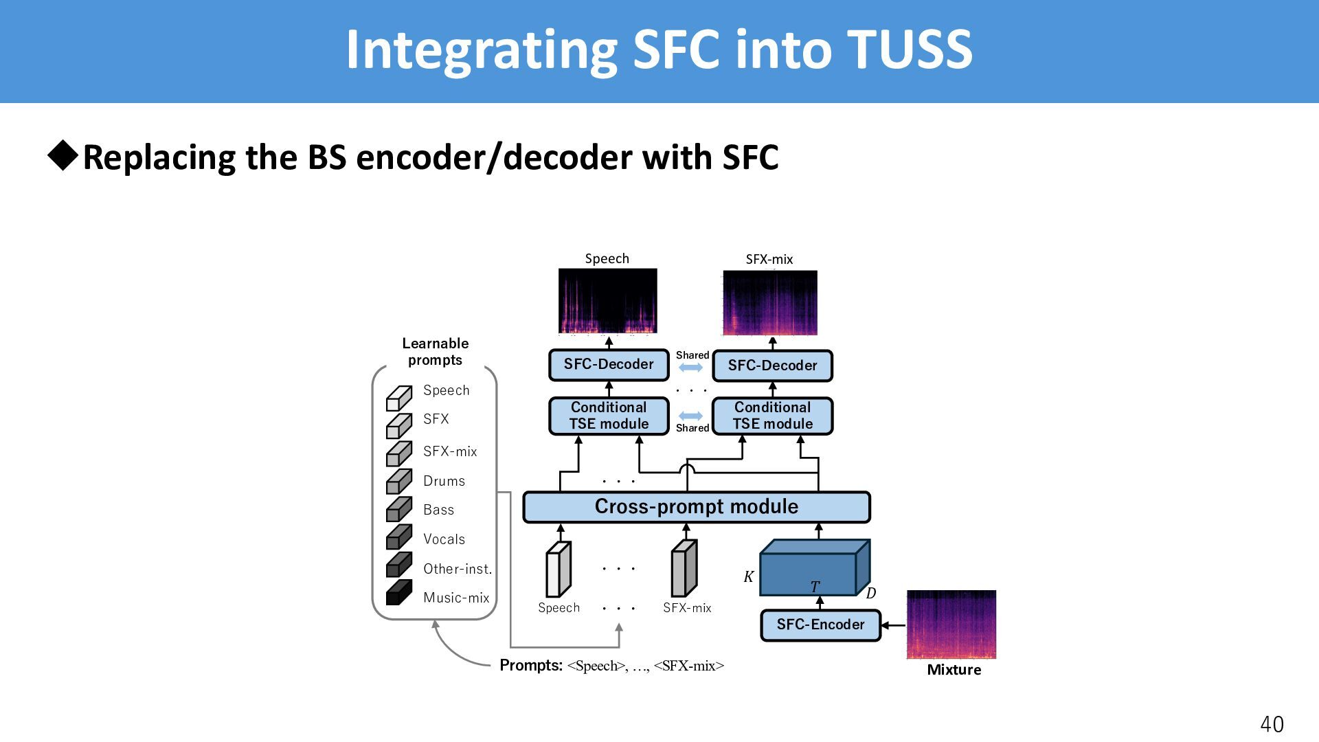 40 ! " # Cross-prompt module Speech Learnable prompts SFX SFX-mix Drums Bass Vocals Other-inst. Music-mix Speech SFX-mix Conditional TSE module ・・・ Conditional TSE module SFC-Decoder SFC-Decoder Prompts: <Speech>, …, <SFX-mix> ・・・ ・・・ Shared Shared SFC-Encoder ・・・ Mixture Speech SFX-mix