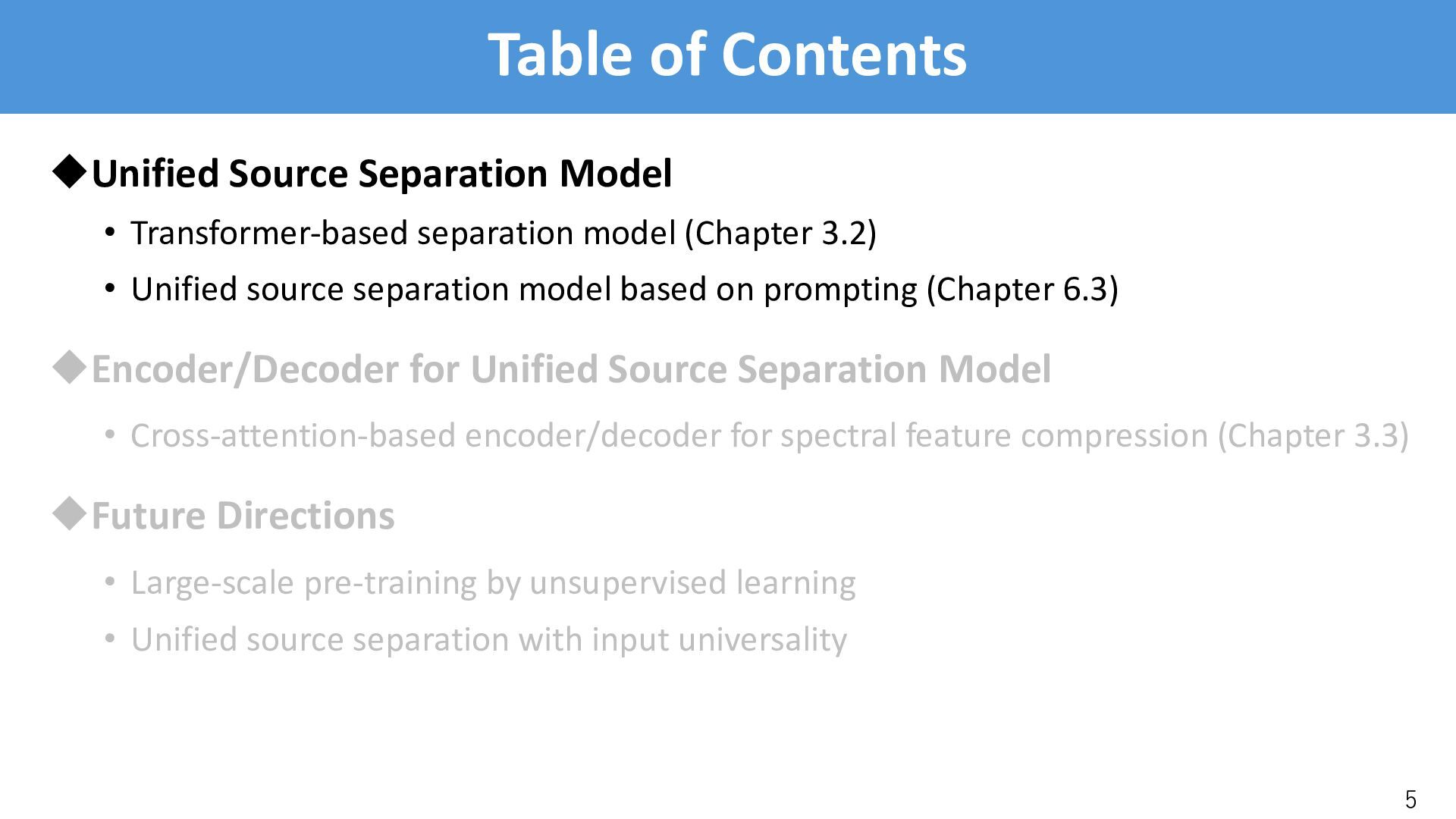 model (Chapter 3.2) • Unified source separation model based on prompting (Chapter 6.3) uEncoder/Decoder for Unified Source Separation Model • Cross-attention-based encoder/decoder for spectral feature compression (Chapter 3.3) uFuture Directions • Large-scale pre-training by unsupervised learning • Unified source separation with input universality 4