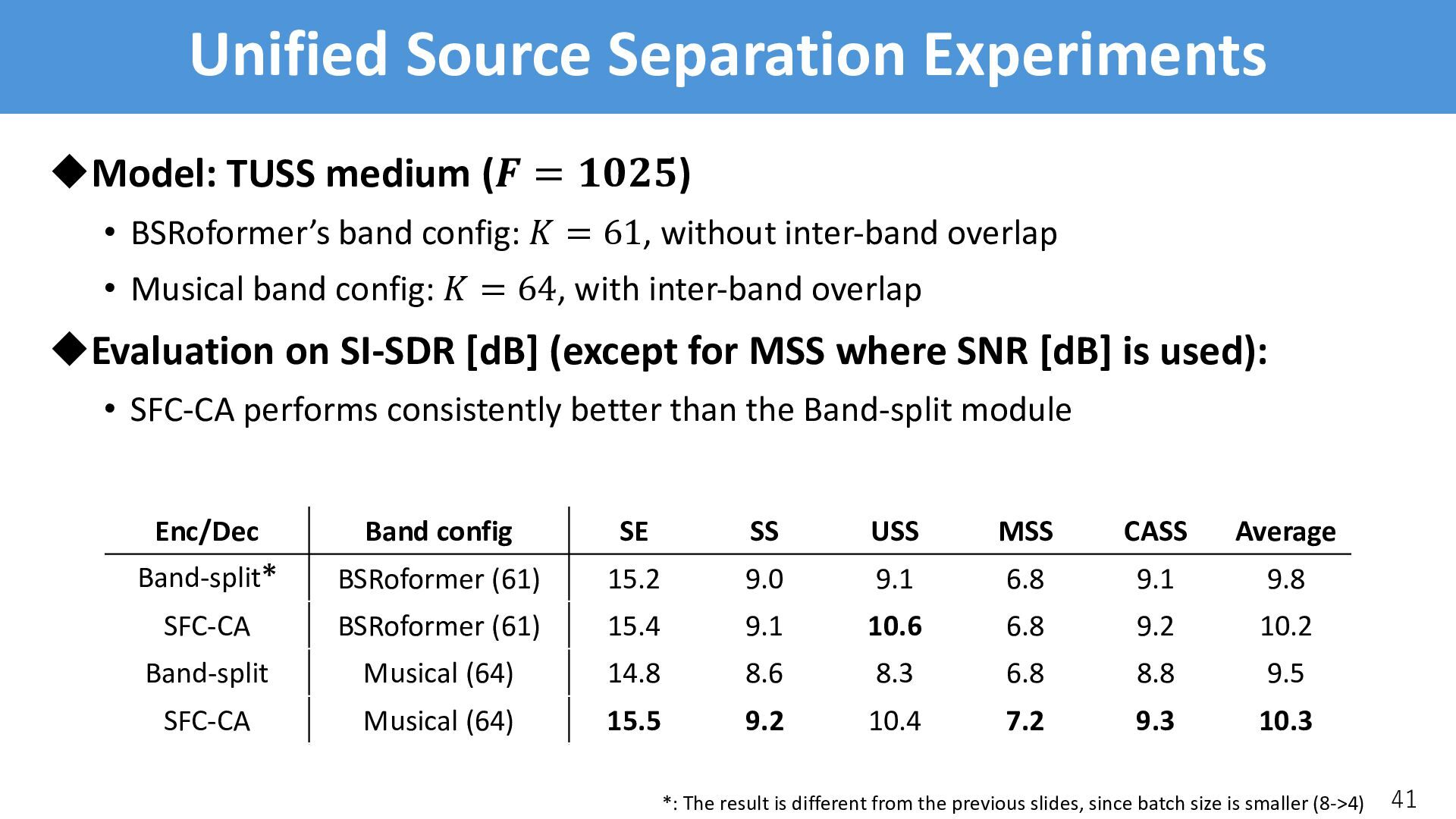 • BSRoformer’s band config: . = 61, without inter-band overlap • Musical band config: . = 64, with inter-band overlap uEvaluation on SI-SDR [dB] (except for MSS where SNR [dB] is used): • SFC-CA performs consistently better than the Band-split module 41 Enc/Dec Band config SE SS USS MSS CASS Average Band-split* BSRoformer (61) 15.2 9.0 9.1 6.8 9.1 9.8 SFC-CA BSRoformer (61) 15.4 9.1 10.6 6.8 9.2 10.2 Band-split Musical (64) 14.8 8.6 8.3 6.8 8.8 9.5 SFC-CA Musical (64) 15.5 9.2 10.4 7.2 9.3 10.3 *: The result is different from the previous slides, since batch size is smaller (8->4)