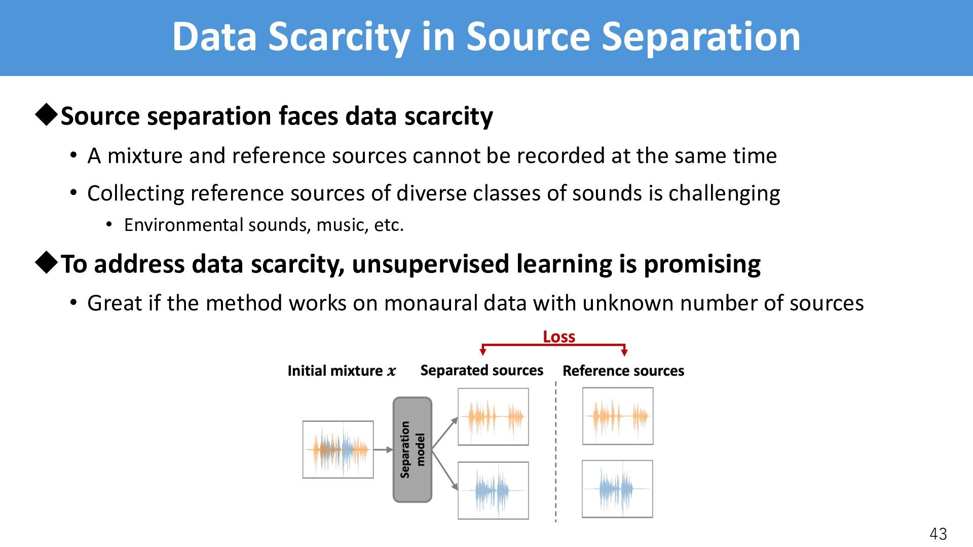• A mixture and reference sources cannot be recorded at the same time • Collecting reference sources of diverse classes of sounds is challenging • Environmental sounds, music, etc. uTo address data scarcity, unsupervised learning is promising • Great if the method works on monaural data with unknown number of sources 43