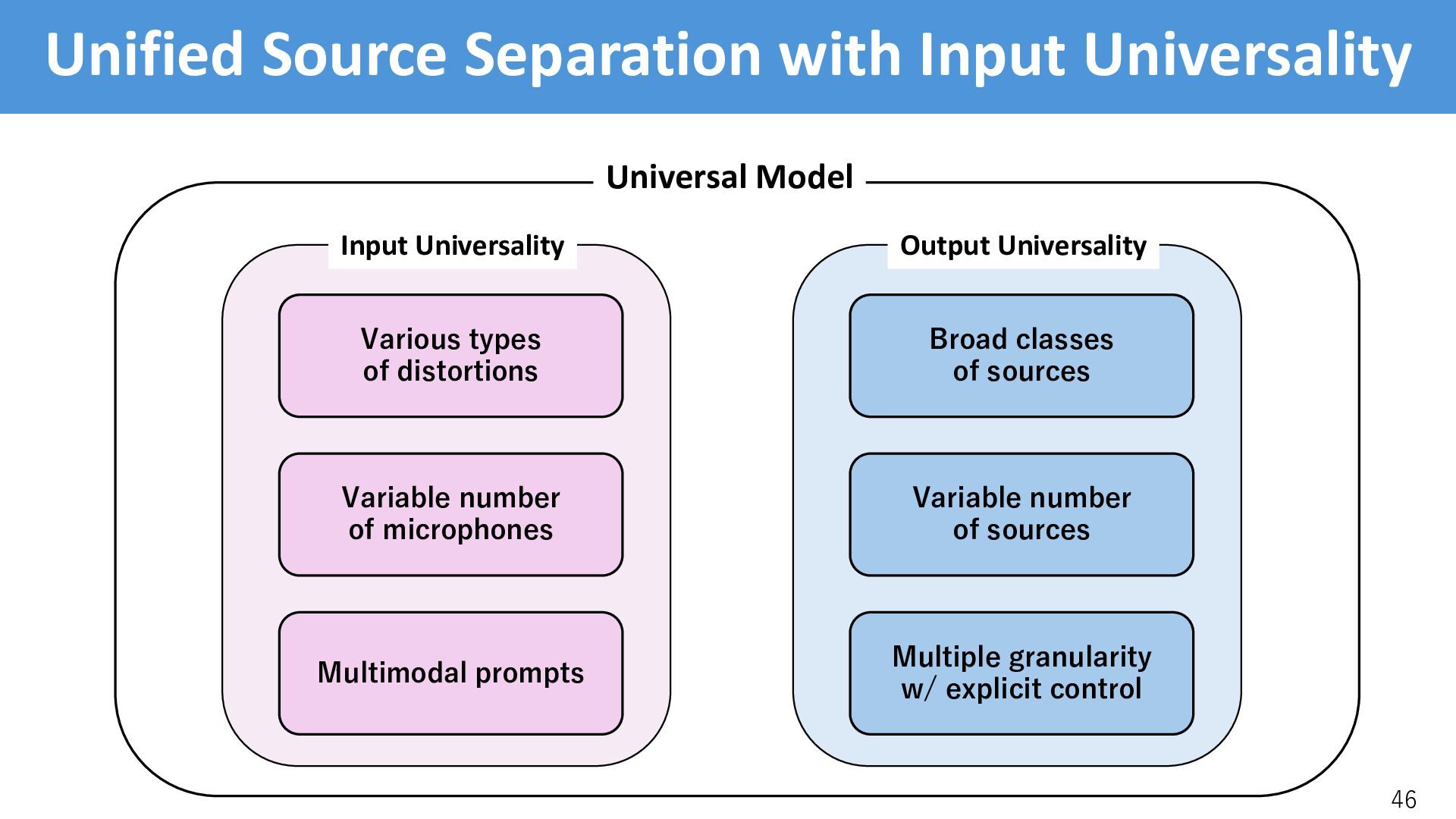 sources Multiple granularity w/ explicit control Broad classes of sources Output Universality Variable number of microphones Multimodal prompts Various types of distortions Input Universality Universal Model