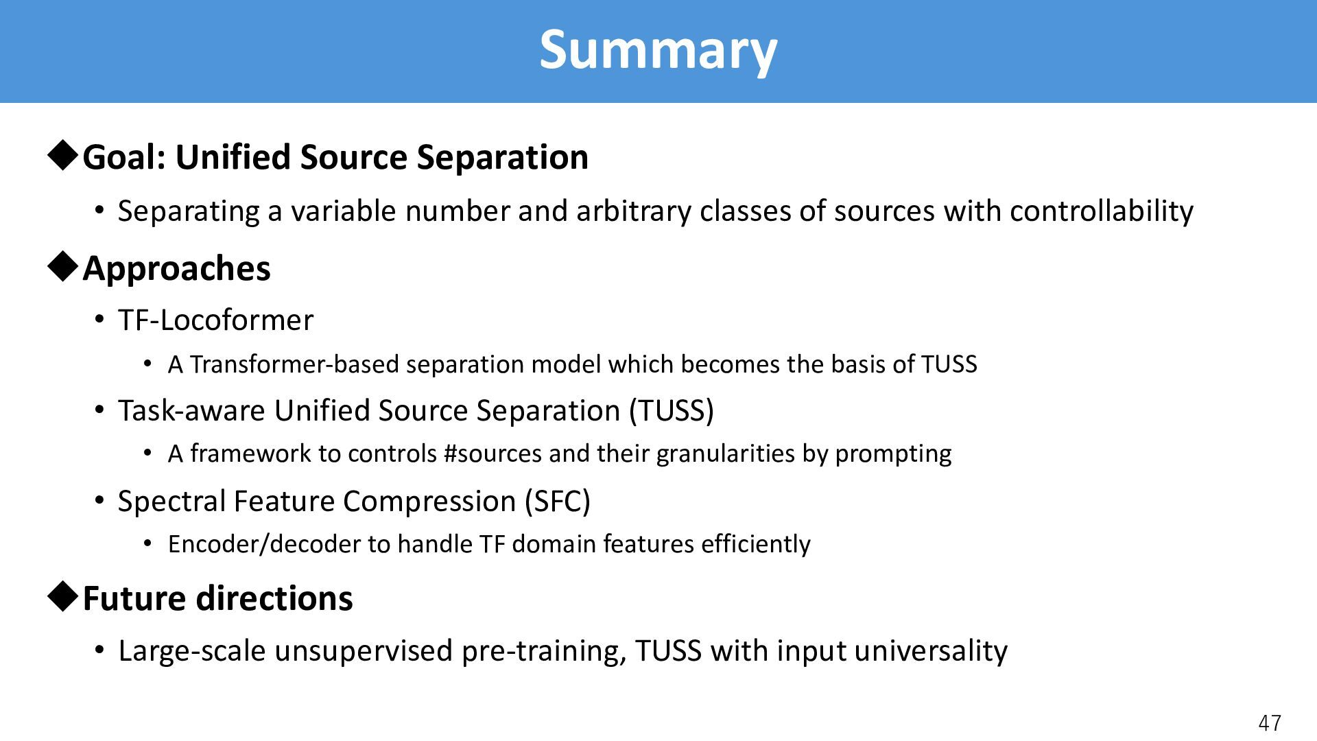 and arbitrary classes of sources with controllability uApproaches • TF-Locoformer • A Transformer-based separation model which becomes the basis of TUSS • Task-aware Unified Source Separation (TUSS) • A framework to controls #sources and their granularities by prompting • Spectral Feature Compression (SFC) • Encoder/decoder to handle TF domain features efficiently uFuture directions • Large-scale unsupervised pre-training, TUSS with input universality 47