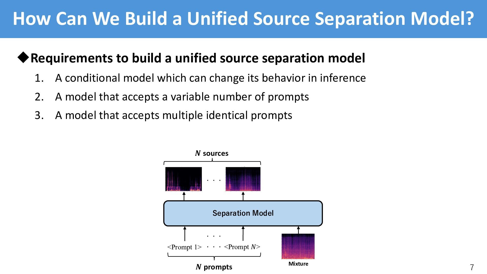 to build a unified source separation model 1. A conditional model which can change its behavior in inference 2. A model that accepts a variable number of prompts 3. A model that accepts multiple identical prompts 7 Separation Model Mixture <Prompt 1> <Prompt !> ・・・ ・・・ ! prompts ! sources ・・・