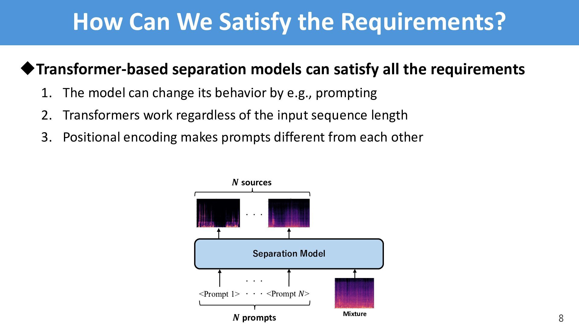 satisfy all the requirements 1. The model can change its behavior by e.g., prompting 2. Transformers work regardless of the input sequence length 3. Positional encoding makes prompts different from each other 8 Separation Model Mixture <Prompt 1> <Prompt !> ・・・ ・・・ ! prompts ! sources ・・・