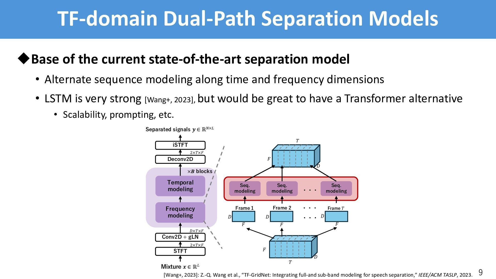 model • Alternate sequence modeling along time and frequency dimensions • LSTM is very strong [Wang+, 2023], but would be great to have a Transformer alternative • Scalability, prompting, etc. 9 Frequency modeling Temporal modeling Conv2D + gLN STFT iSTFT Deconv2D Separated signals ! ∈ ℝ!×# Mixture $ ∈ ℝ# 2×%×& '×%×& 2×%×& ×" blocks # $ % # $ # $ # Frame 1 Frame 2 Frame ! $ ・・・ ・・・ Seq. modeling Seq. modeling Seq. modeling ・・・ # $ % [Wang+, 2023]: Z.-Q. Wang et al., “TF-GridNet: Integrating full-and sub-band modeling for speech separation,” IEEE/ACM TASLP, 2023.