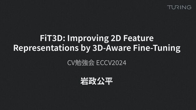 2D foundation features. Our method starts with lifting 2D image features (e.g. DINOv2 [44]) (b) to a 3D representation. Then we finetune the 2D foundation model using the 3D-aware features (c). We demonstrate that incorporating the fine-tuned features (d) results in improved performance on downstream tasks such as semantic segmentation and depth estimation on a variety of datasets with simple linear probing (right). Feature maps are visualized using principal component analysis (PCA). Figure 1: 2D基盤特徴を向上させるために3D対応のfine-tuning⼿法を提案する。この⽅法では、まず2D画像特徴(e.g., DINOv2 [44])(b)を3D表現に変換する。 次に、3D対応の特徴 (c) を使⽤して2D基盤モデルをfine-tuningする。fine-tuningした特徴 (d) を取り⼊れることで、semantic segmentationや深度推定などの下 流タスクの性能が向上することを⽰した。この性能向上は、様々なデータセット上で単純な線形プロービング (右) を⽤いることで確認できる。 特徴マップは主成分分析 (PCA) を⽤いて可視化する。
