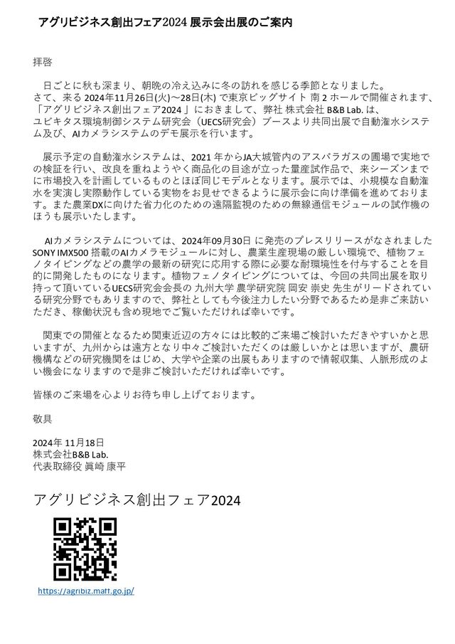 株式会社 B&B Lab. は、 ユビキタス環境制御システム研究会(UECS研究会)ブースより共同出展で自動潅水システ ム及び、AIカメラシステムのデモ展示を行います。 展示予定の自動潅水システムは、2021 年からJA大城管内のアスパラガスの圃場で実地で の検証を行い、改良を重ねようやく商品化の目途が立った量産試作品で、来シーズンまで に市場投入を計画しているものとほぼ同じモデルとなります。展示では、小規模な自動潅 水を実演し実際動作している実物をお見せできるように展示会に向け準備を進めておりま す。また農業DXに向けた省力化のための遠隔監視のための無線通信モジュールの試作機の ほうも展示いたします。 AIカメラシステムについては、2024年09月30日 に発売のプレスリリースがなされました SONY IMX500 搭載のAIカメラモジュールに対し、農業生産現場の厳しい環境で、植物フェ ノタイピングなどの農学の最新の研究に応用する際に必要な耐環境性を付与することを目 的に開発したものになります。植物フェノタイピングについては、今回の共同出展を取り 持って頂いているUECS研究会会⾧の 九州大学 農学研究院 岡安 崇史 先生がリードされてい る研究分野でもありますので、弊社としても今後注力したい分野であるため是非ご来訪い ただき、稼働状況も含め現地でご覧いただければ幸いです。 関東での開催となるため関東近辺の方々には比較的ご来場ご検討いただきやすいかと思 いますが、九州からは遠方となり中々ご検討いただくのは厳しいかとは思いますが、農研 機構などの研究機関をはじめ、大学や企業の出展もありますので情報収集、人脈形成のよ い機会になりますので是非ご検討いただければ幸いです。 皆様のご来場を心よりお待ち申し上げております。 敬具 2024年 11月18日 株式会社B&B Lab. 代表取締役 眞崎 康平 アグリビジネス創出フェア2024 展示会出展のご案内 https://agribiz.maff.go.jp/ アグリビジネス創出フェア2024