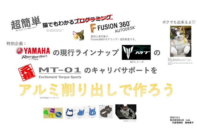 ヤマハ発動機 元ネタ:猫でもわかるプログラミング http://www.kumei.ne.jp/c_lang/ 特別企画: ※作例はイメージです。 ※A7075超々ジュラルミン 2022.11.2 株式会社B&B Lab. 代表取締役 眞崎康平