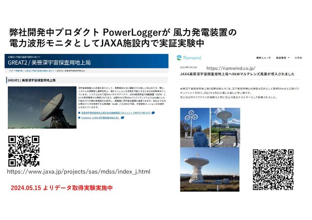 弊社開発中プロダクト PowerLoggerが 風力発電装置の 電力波形モニタとしてJAXA施設内で実証実験中 https://riamwind.co.jp/ https://www.jaxa.jp/projects/sas/mdss/index_j.html 2024.05.15 よりデータ取得実験実施中