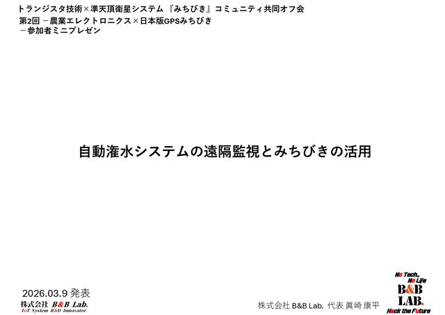 トランジスタ技術×準天頂衛星システム『みちびき』コミュニティ共同オフ会 第2回 -農業エレクトロニクス×日本版GPSみちびき- 場所:X-NIHONBASHI BASE(⽇本橋アイティビル) 2026年3月9日(月) https://www.crossu.org/event/260309ib/