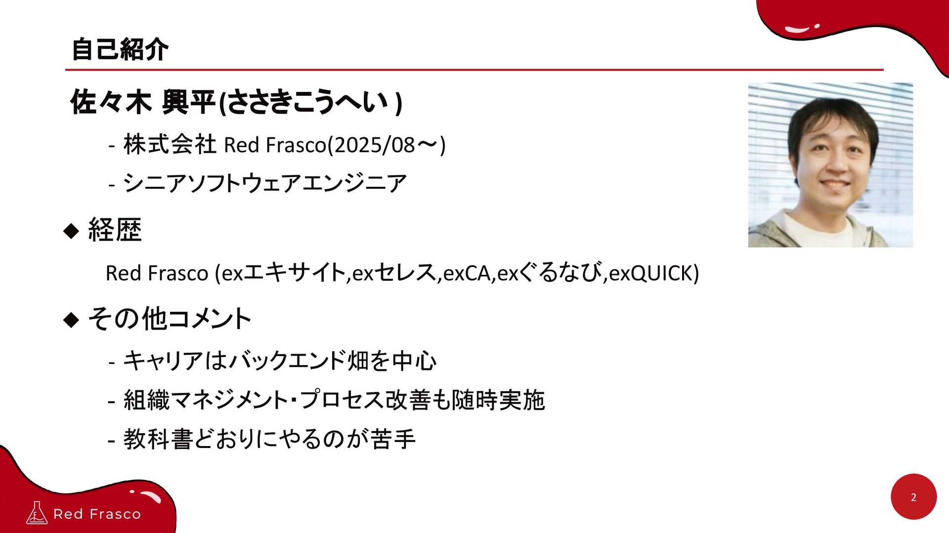1. 自己紹介 佐々木 興平(ささきこうへい ) - 株式会社 Red Frasco(2025/08〜) - シニアソフトウェアエンジニア