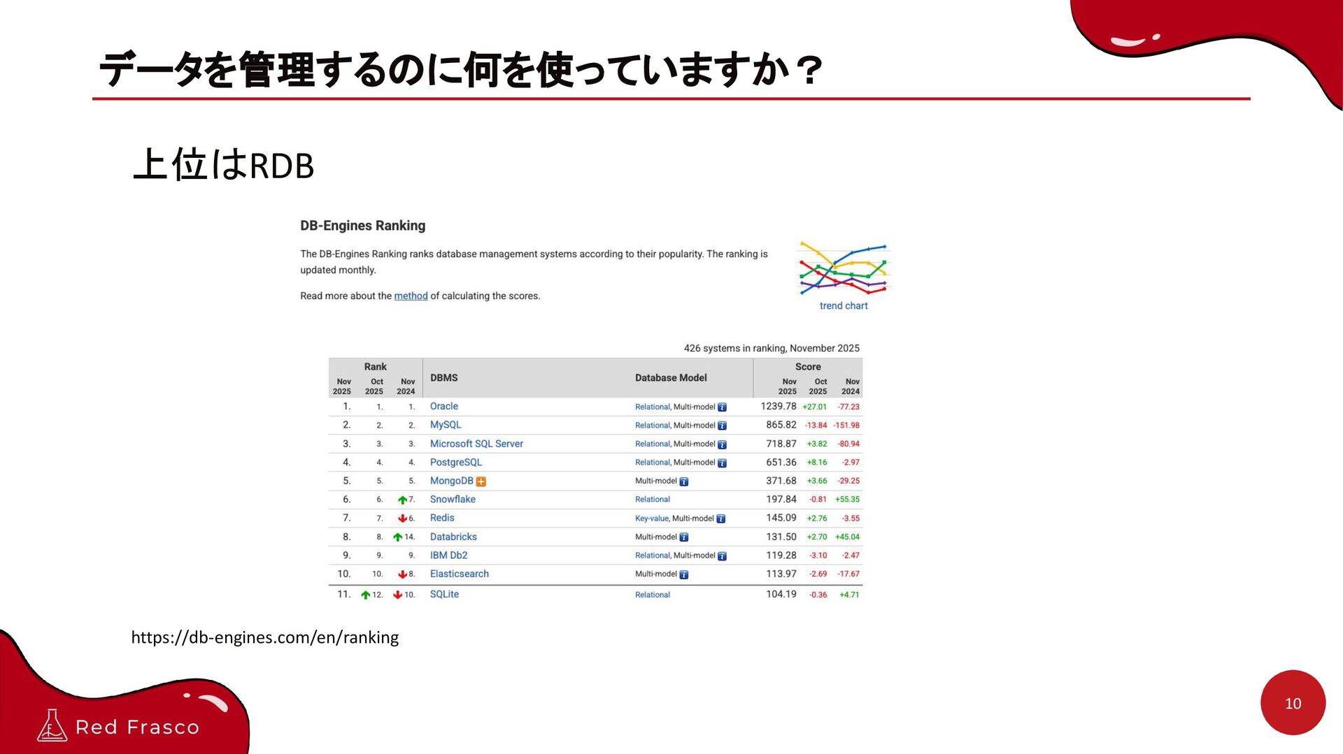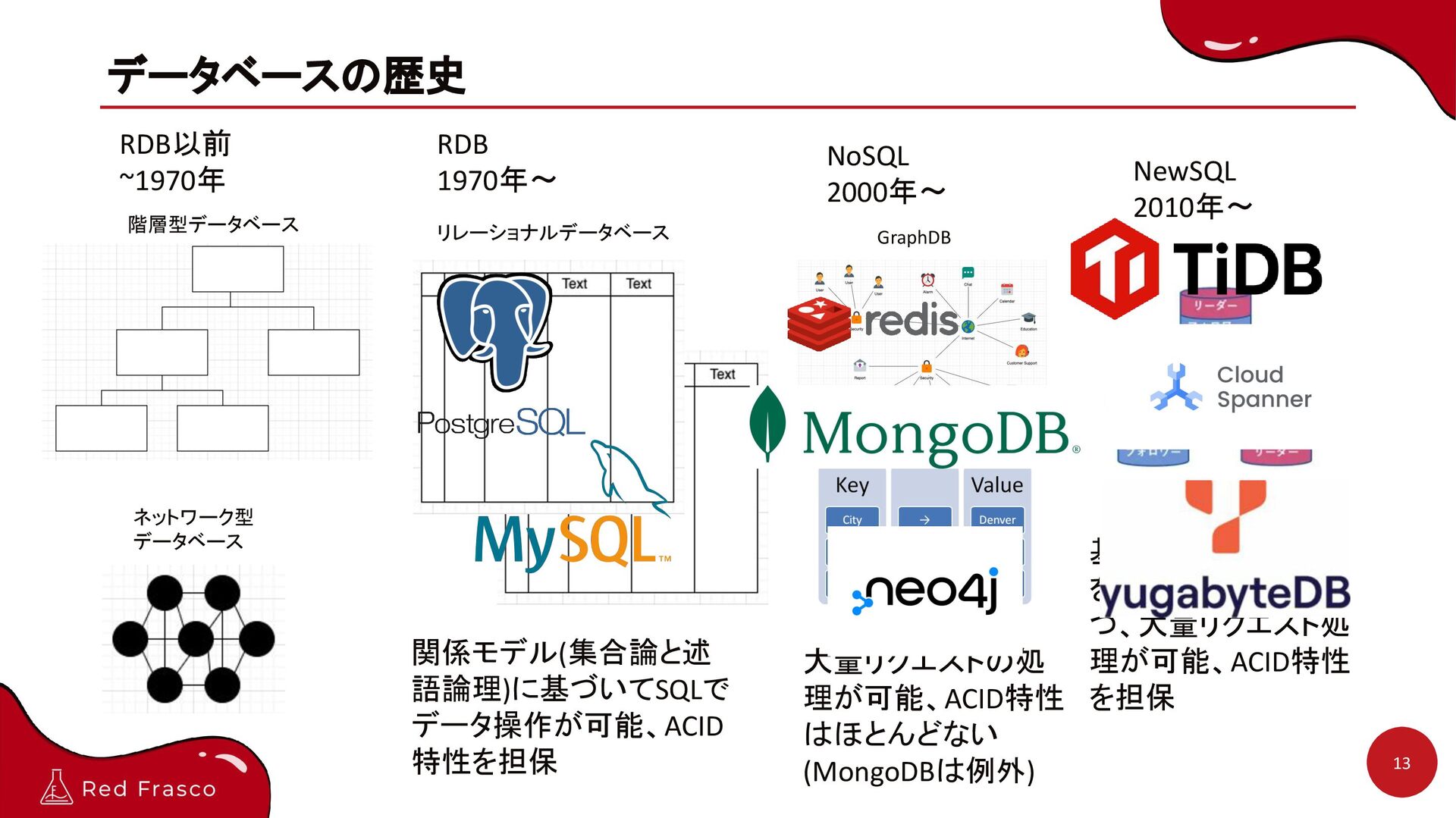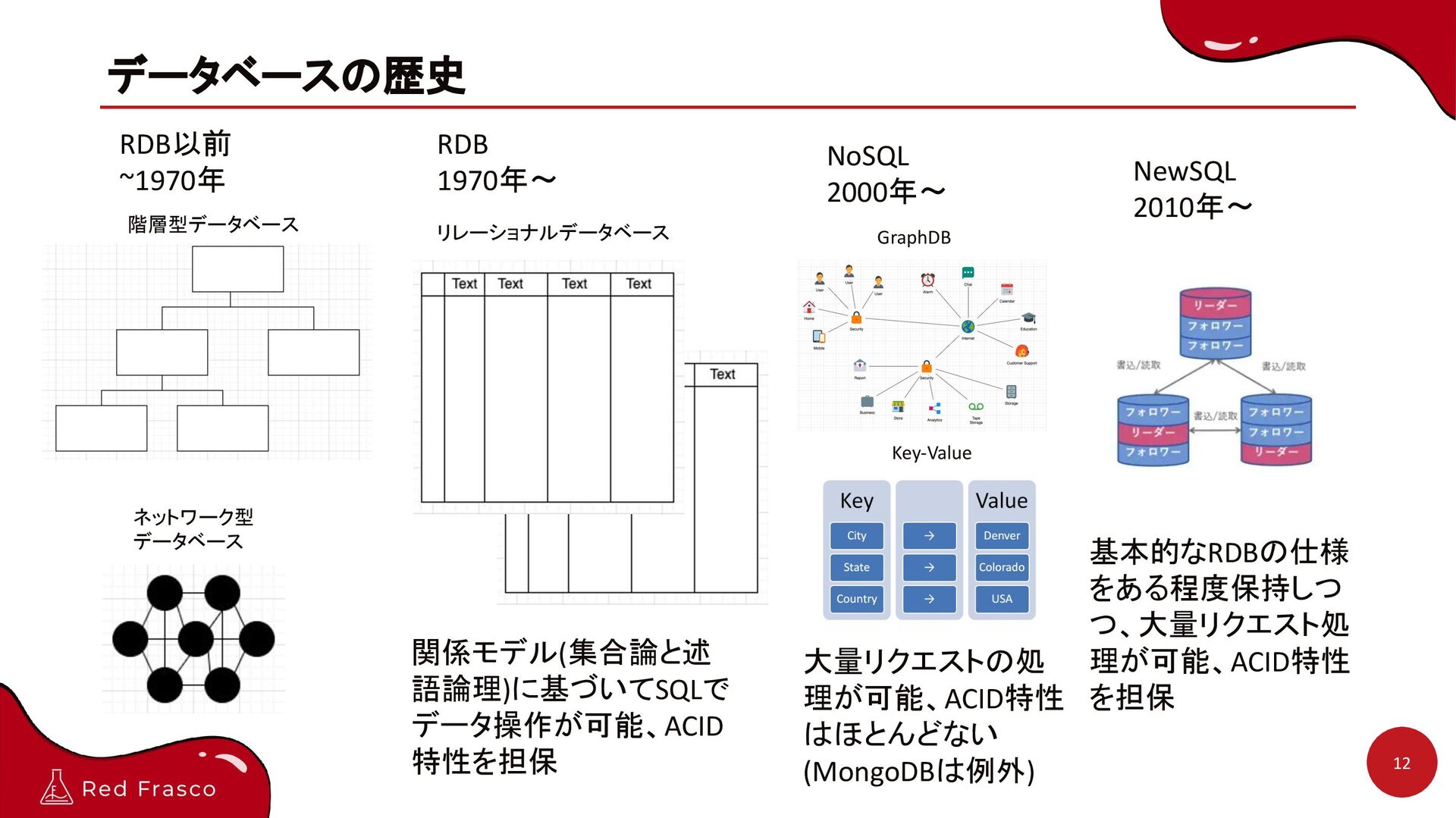 NoSQL 2000年〜 関係モデル(集合論と述 語論理)に基づいてSQLで データ操作が可能、ACID 特性を担保 GraphDB Key-Value NewSQL 2010年〜 大量リクエストの処 理が可能、ACID特性 はほとんどない (MongoDBは例外) 基本的なRDBの仕様 をある程度保持しつ つ、大量リクエスト処 理が可能、ACID特性 を担保
