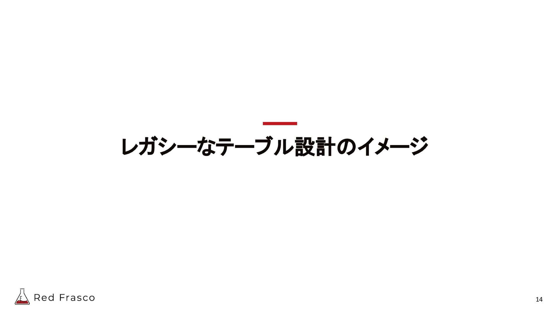 13. 変更容易で柔軟なテーブル設計にするには? 過去に対する変更を行わない - ALTER文を実行するデメリット - カラム追加により、過去の設計に改変を加えている - 過去のデータのデフォルト値どうするんだっけ?など余計なことを考える - ALTER文の実行中にロックがかかったりする(Online