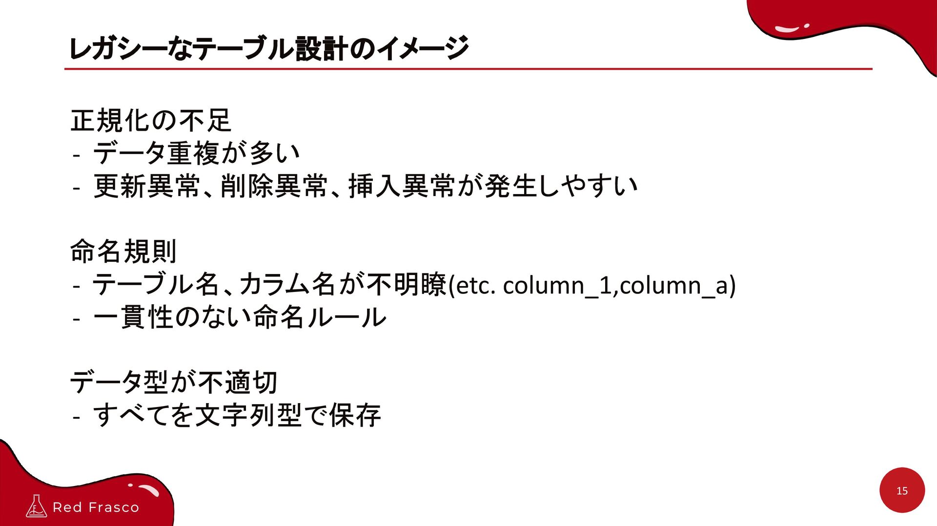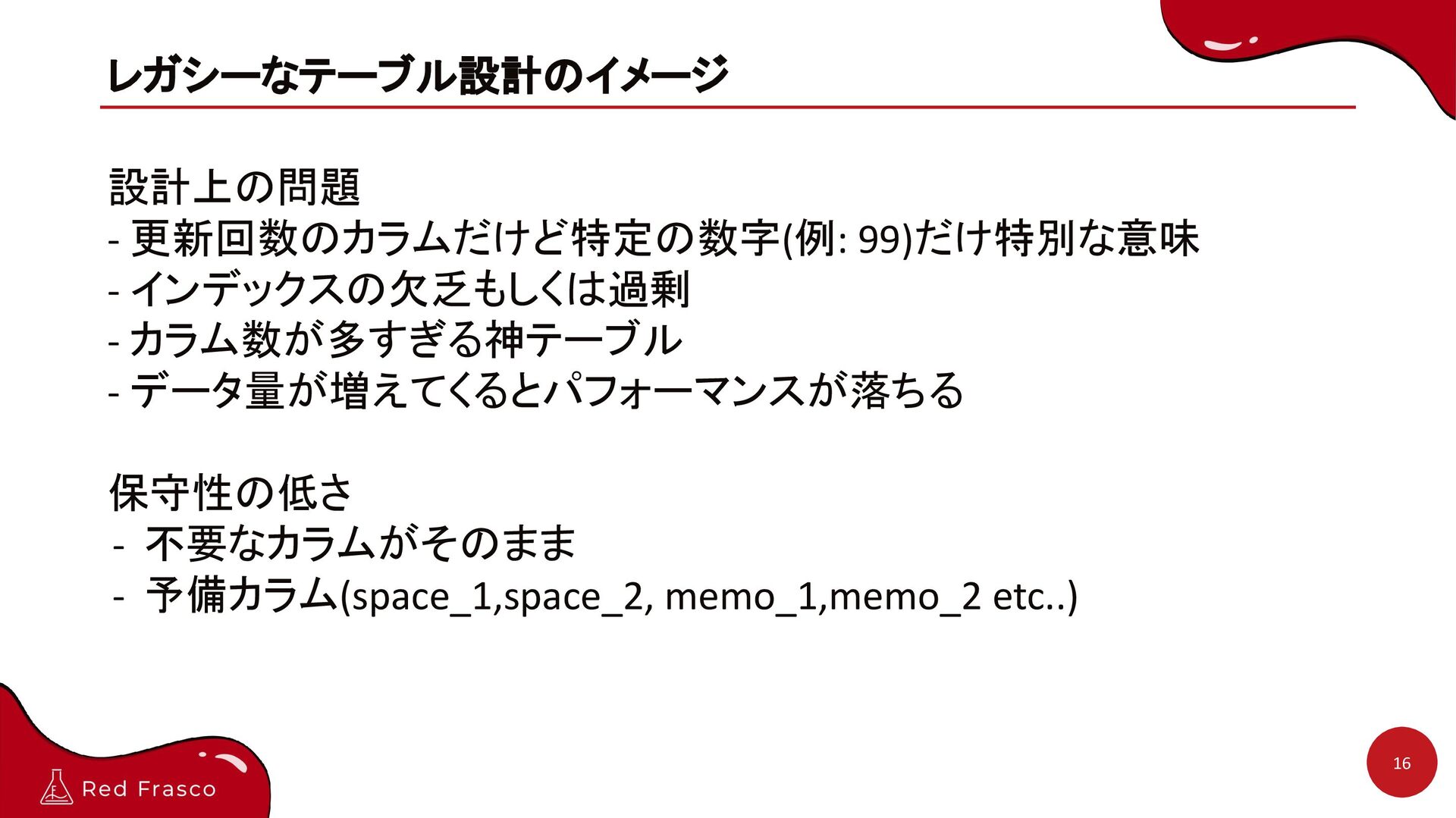 - データ量が増えてくるとパフォーマンスが落ちる 保守性の低さ - 不要なカラムがそのまま - 予備カラム(space_1,space_2, memo_1,memo_2 etc..)
