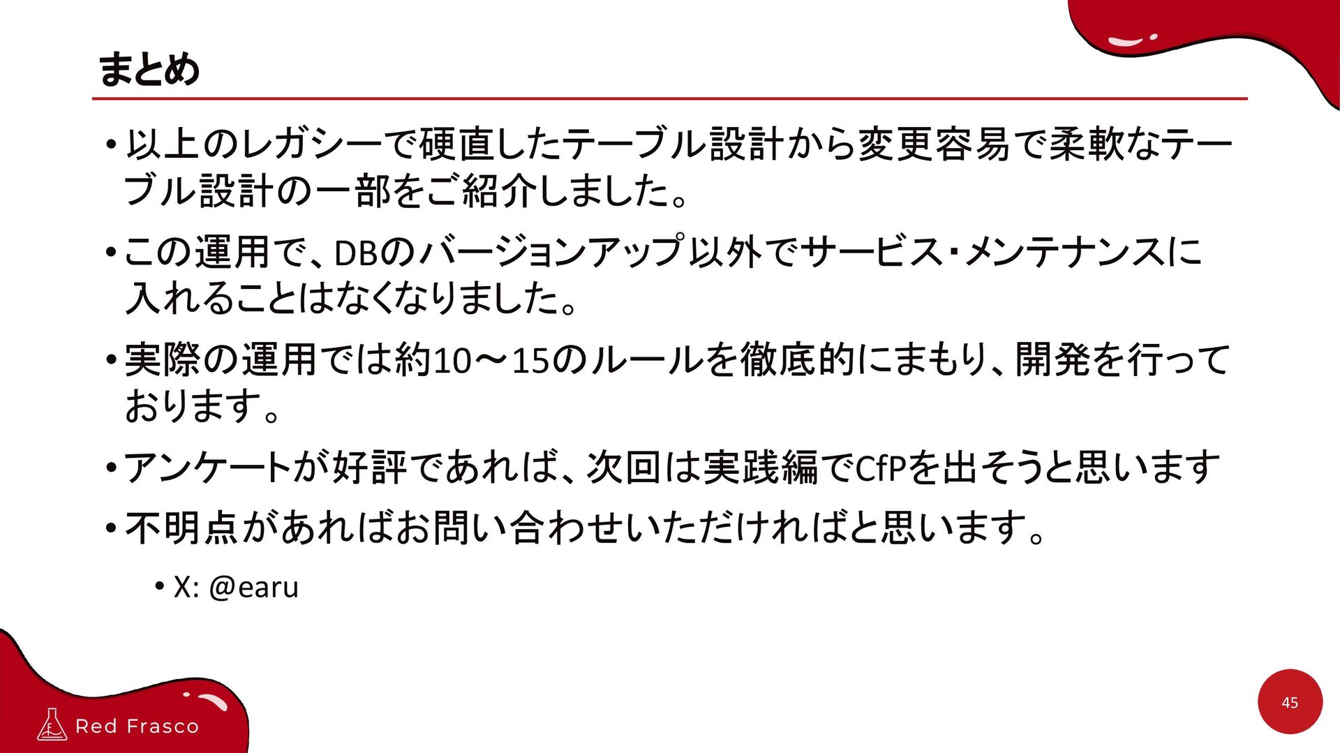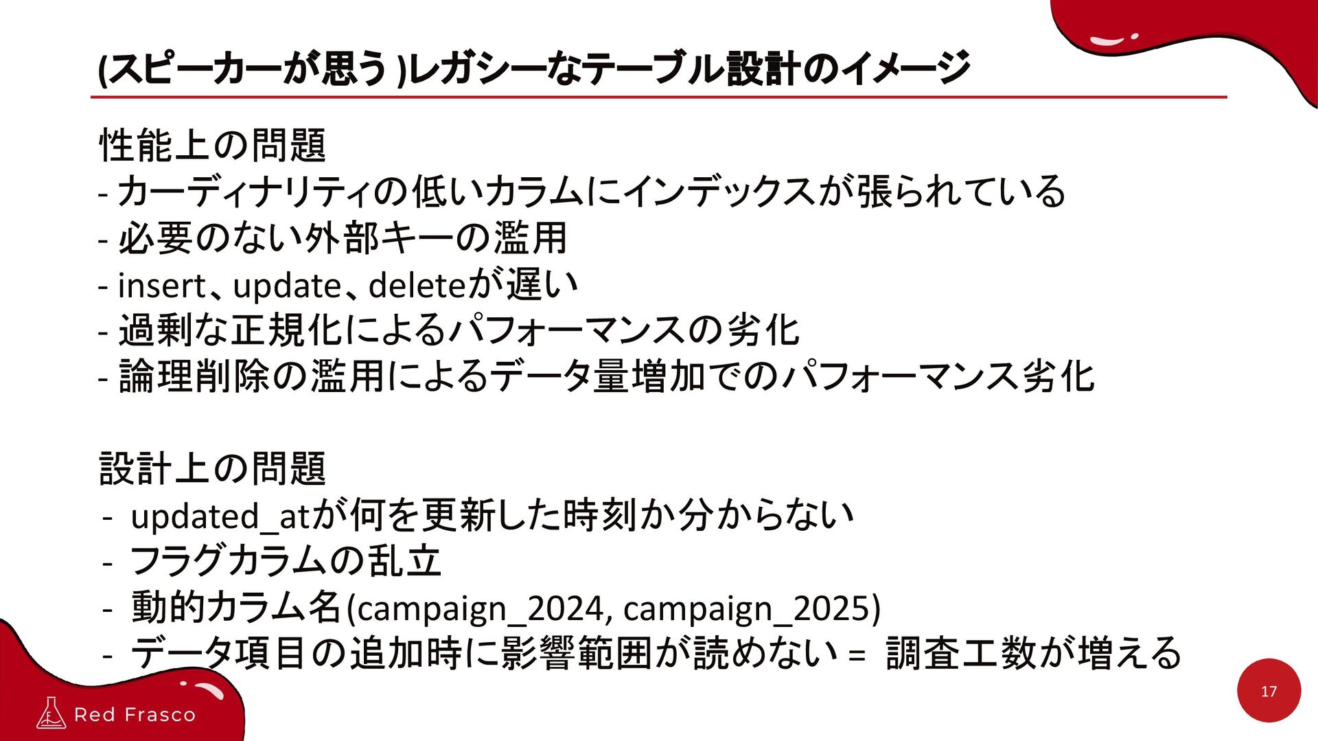 - 過剰な正規化によるパフォーマンスの劣化 - 論理削除の濫用によるデータ量増加でのパフォーマンス劣化 設計上の問題 - updated_atが何を更新した時刻か分からない - フラグカラムの乱立 - 動的カラム名(campaign_2024, campaign_2025) - データ項目の追加時に影響範囲が読めない = 調査工数が増える