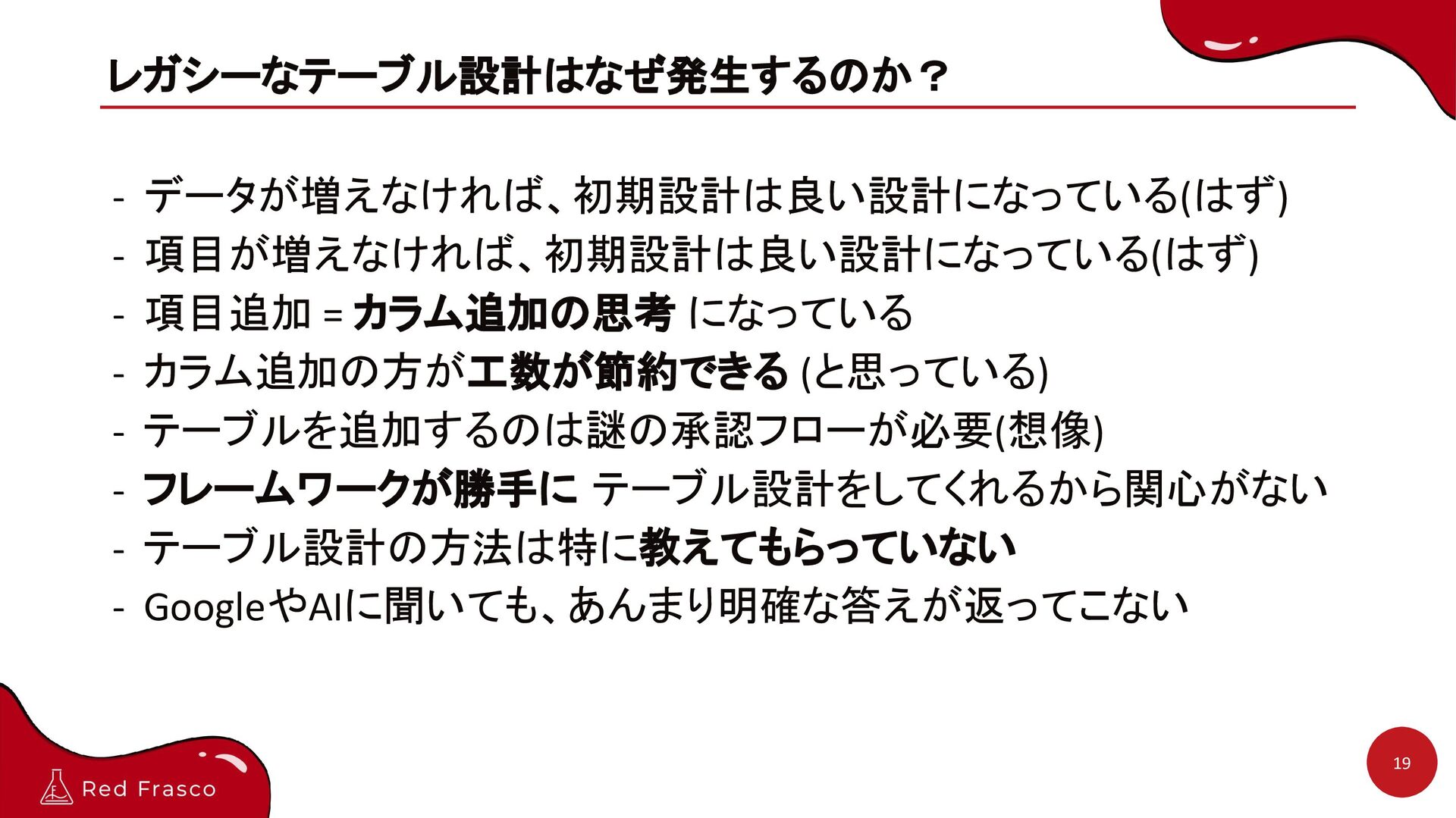 になっている - カラム追加の方が工数が節約できる (と思っている) - テーブルを追加するのは謎の承認フローが必要(想像) - フレームワークが勝手に テーブル設計をしてくれるから関心がない - テーブル設計の方法は特に教えてもらっていない - GoogleやAIに聞いても、あんまり明確な答えが返ってこない