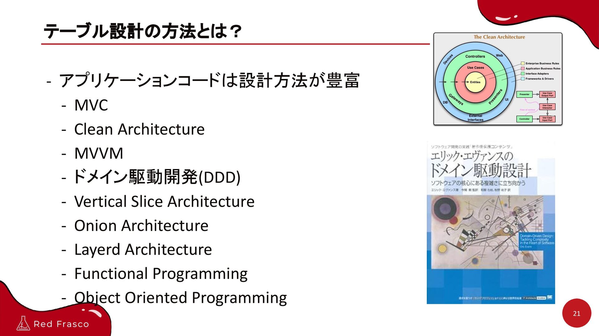 7. テーブル設計の方法とは? 21 - アプリケーションコードは設計方法が豊富 - MVC - Clean Architecture -