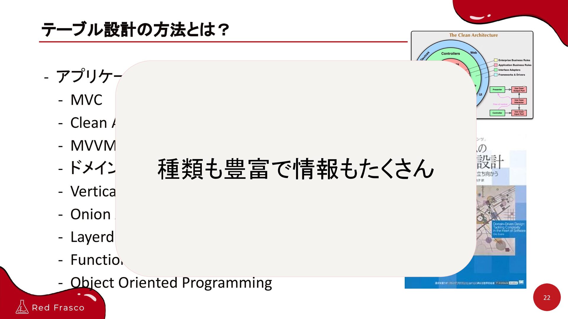8. テーブル設計の方法とは? 22 - アプリケーションコードは設計方法が豊富 - MVC - Clean Architecture -