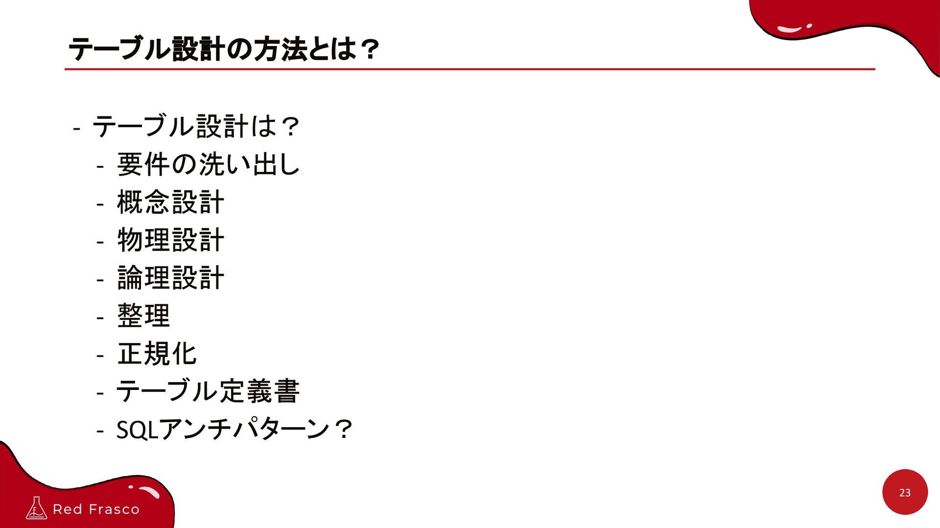 - 論理設計 - 整理 - 正規化 - テーブル定義書 - SQLアンチパターン?