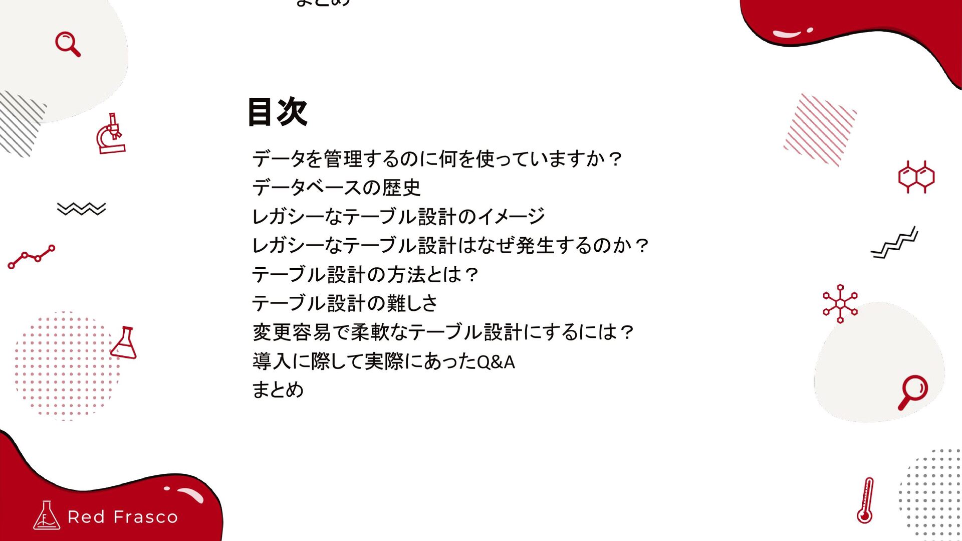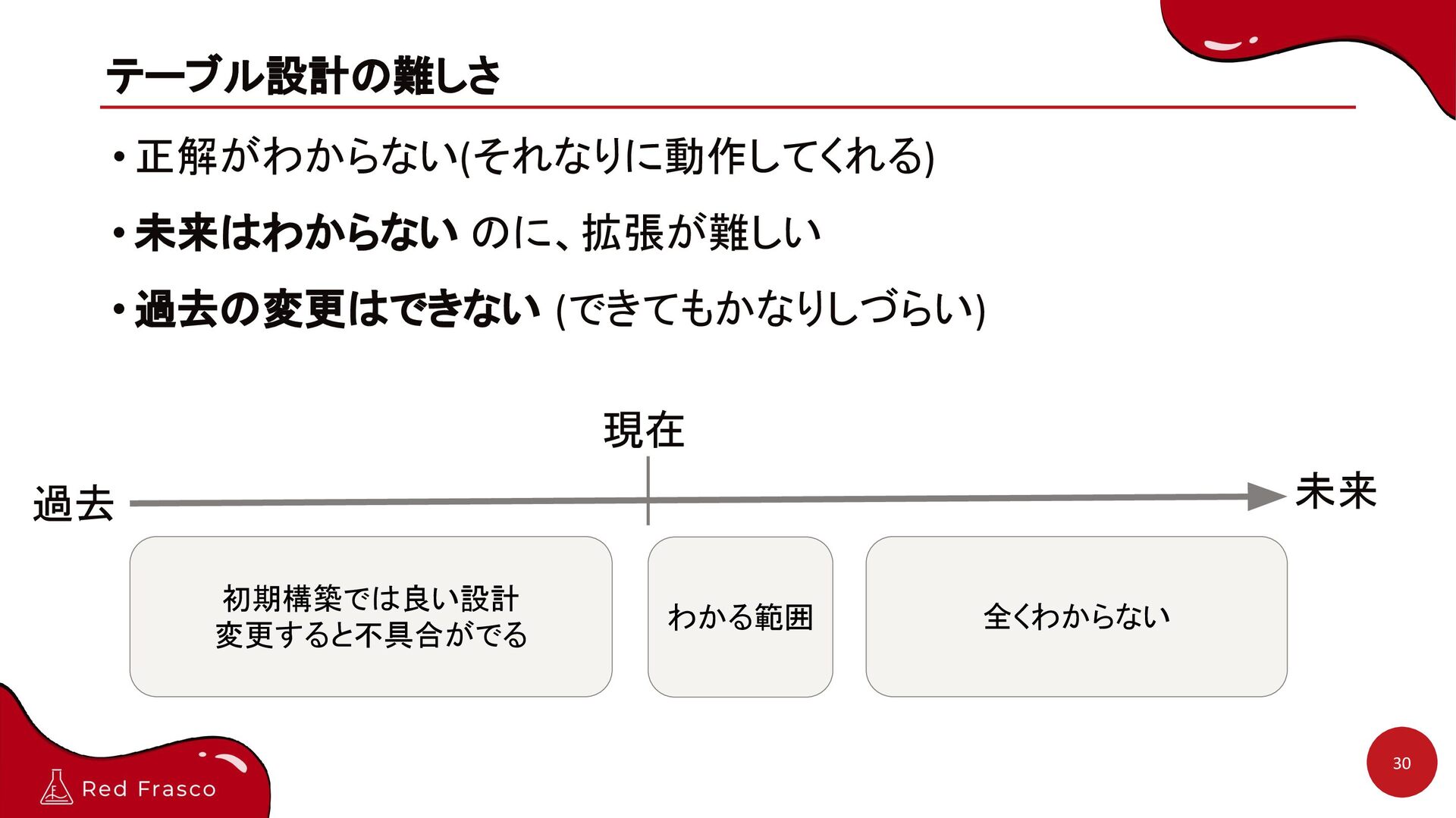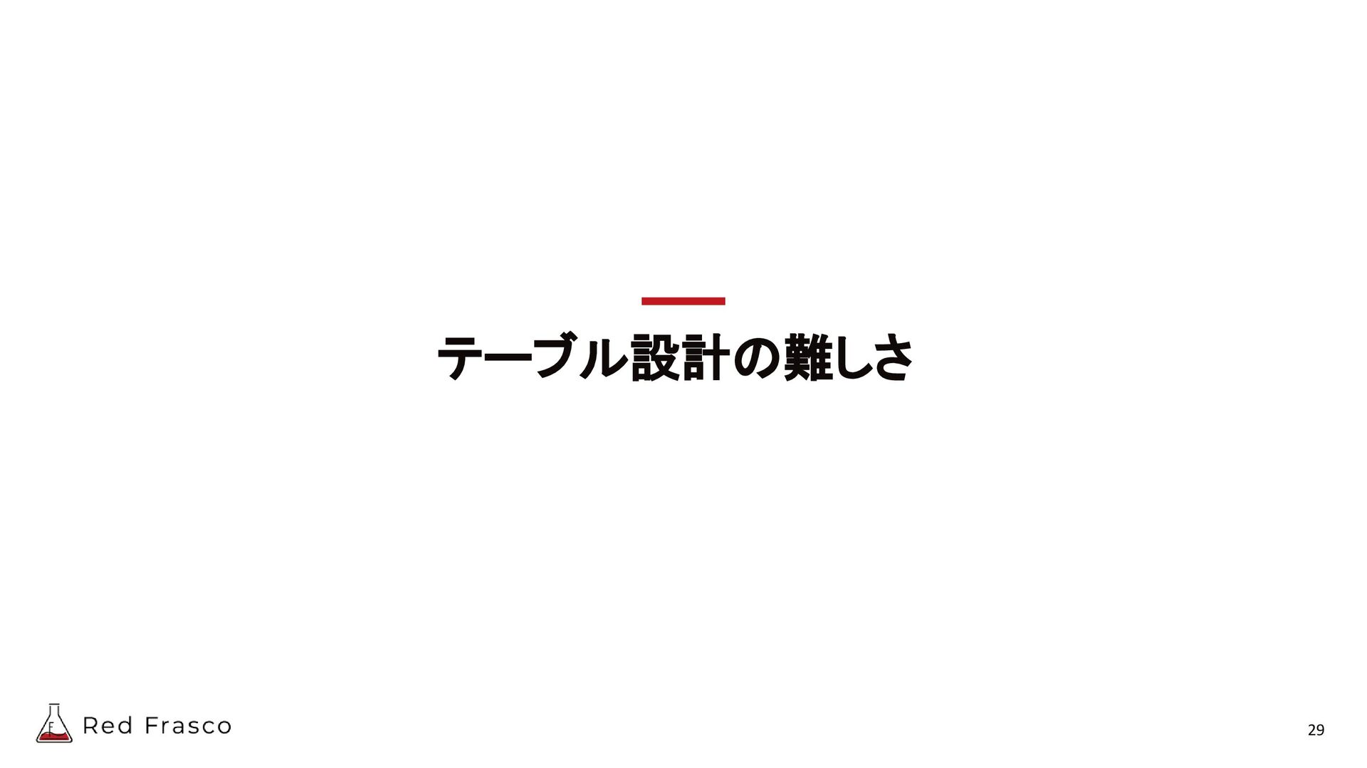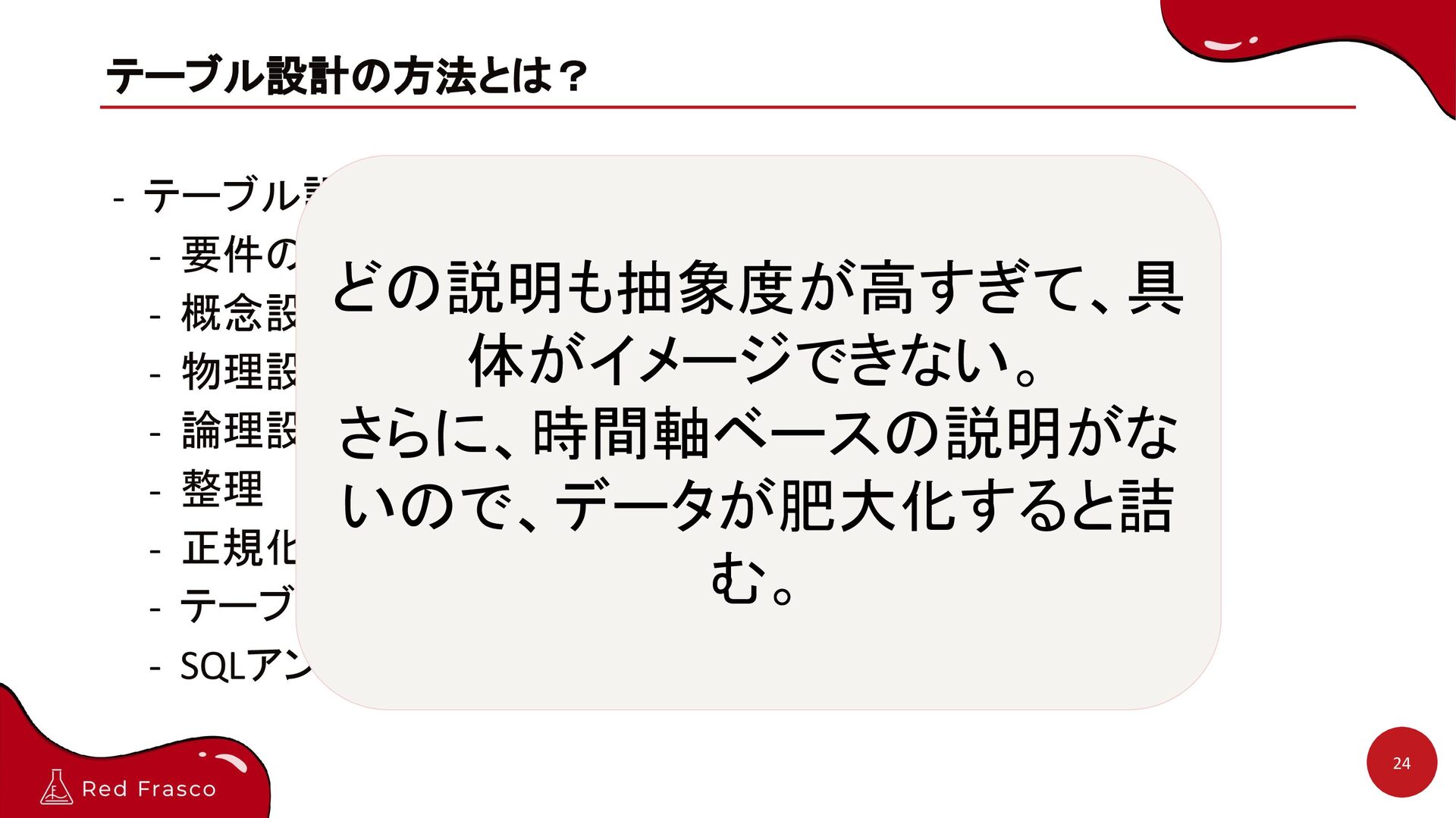 - 論理設計 - 整理 - 正規化 - テーブル定義書 - SQLアンチパターン? どの説明も抽象度が高すぎて、具 体がイメージできない。 さらに、時間軸ベースの説明がな いので、データが肥大化すると詰 む。
