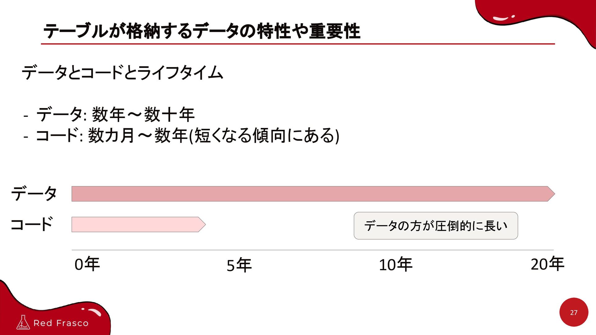 11. テーブルが格納するデータの特性や重要性 28 データとコードの経過年数と物量 - データ: 経過年数 x 利用頻度で積み上がっていく - コード: