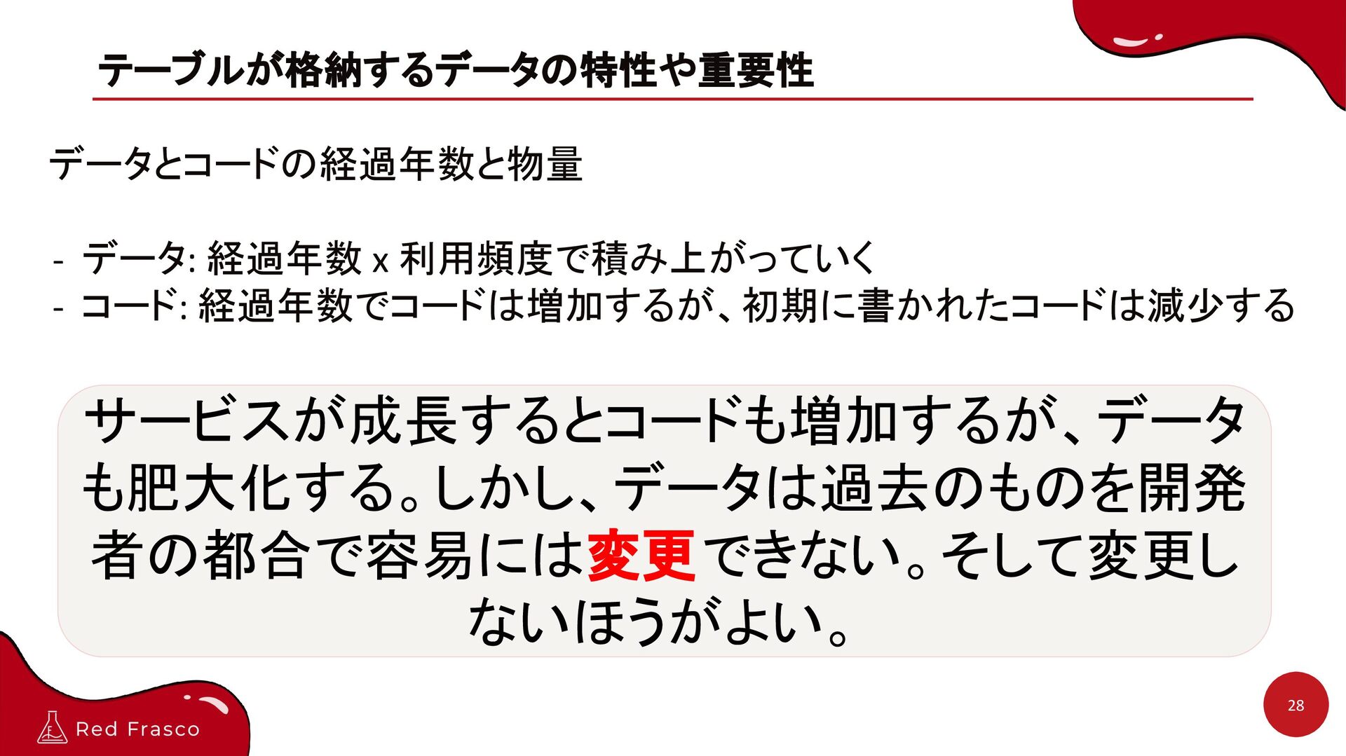 経過年数でコードは増加するが、初期に書かれたコードは減少する サービスが成長するとコードも増加するが、データ も肥大化する。しかし、データは過去のものを開発 者の都合で容易には変更できない。そして変更し ないほうがよい。