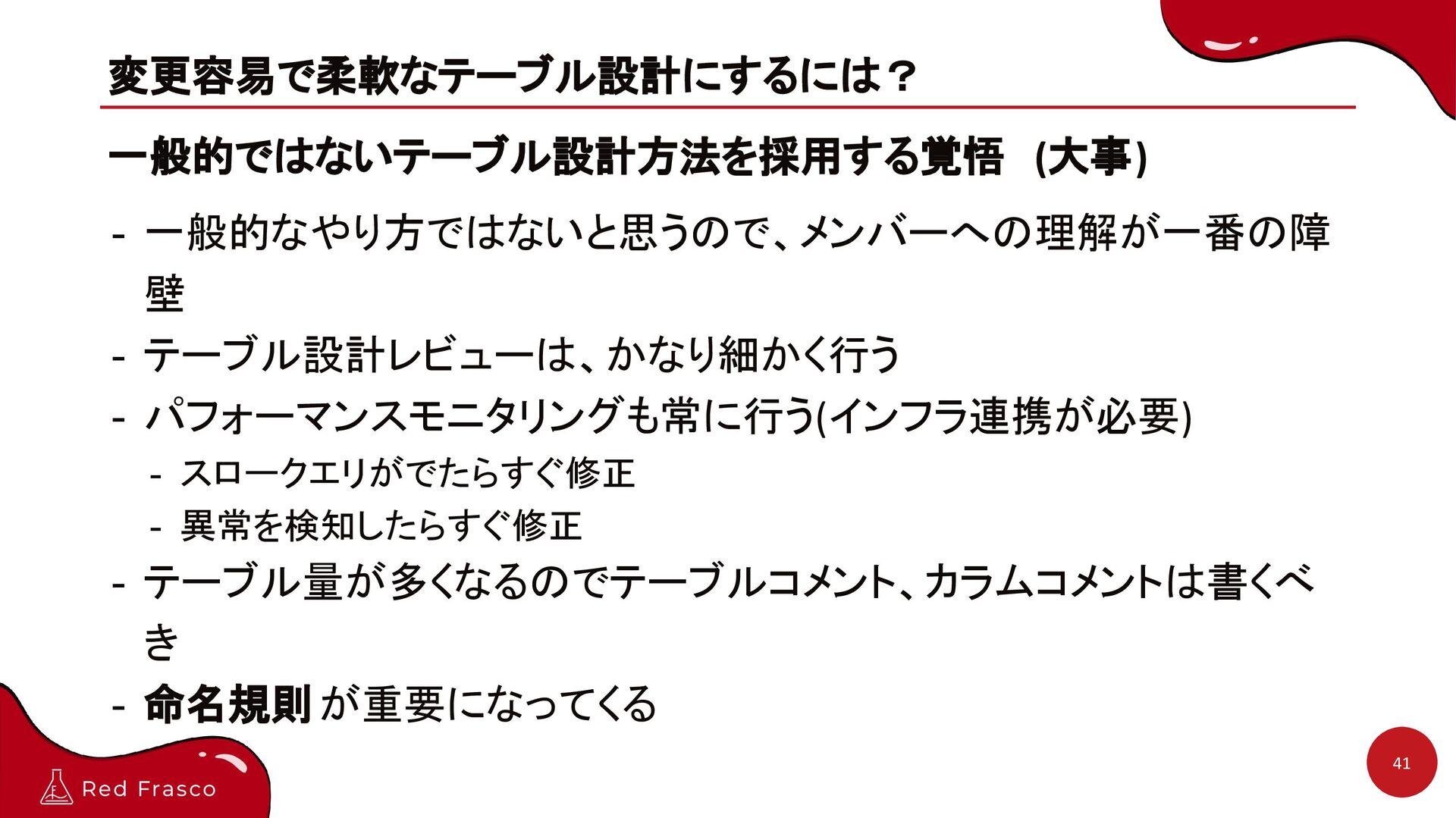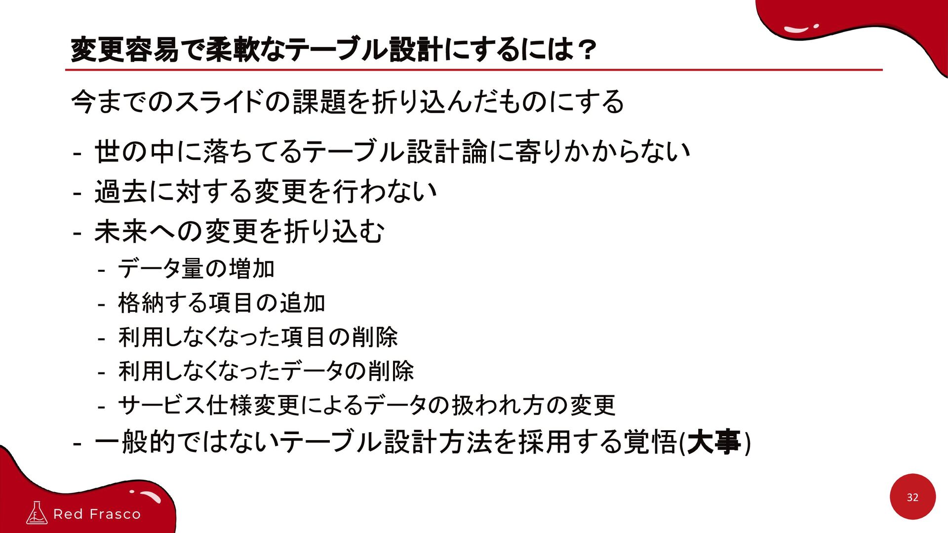 - 格納する項目の追加 - 利用しなくなった項目の削除 - 利用しなくなったデータの削除 - サービス仕様変更によるデータの扱われ方の変更 - 一般的ではないテーブル設計方法を採用する覚悟(大事) 32