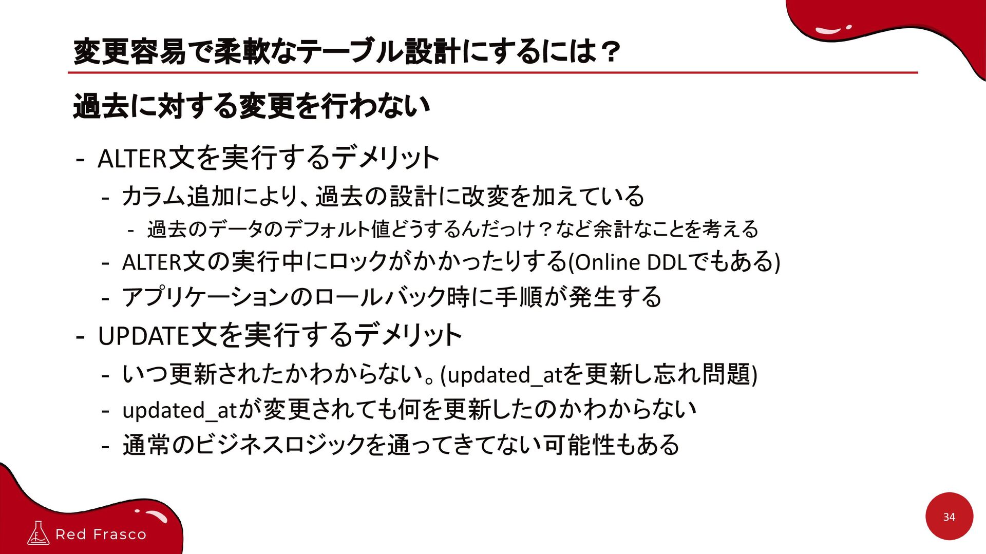 DDLでもある) - アプリケーションのロールバック時に手順が発生する - UPDATE文を実行するデメリット - いつ更新されたかわからない。(updated_atを更新し忘れ問題) - updated_atが変更されても何を更新したのかわからない - 通常のビジネスロジックを通ってきてない可能性もある 34