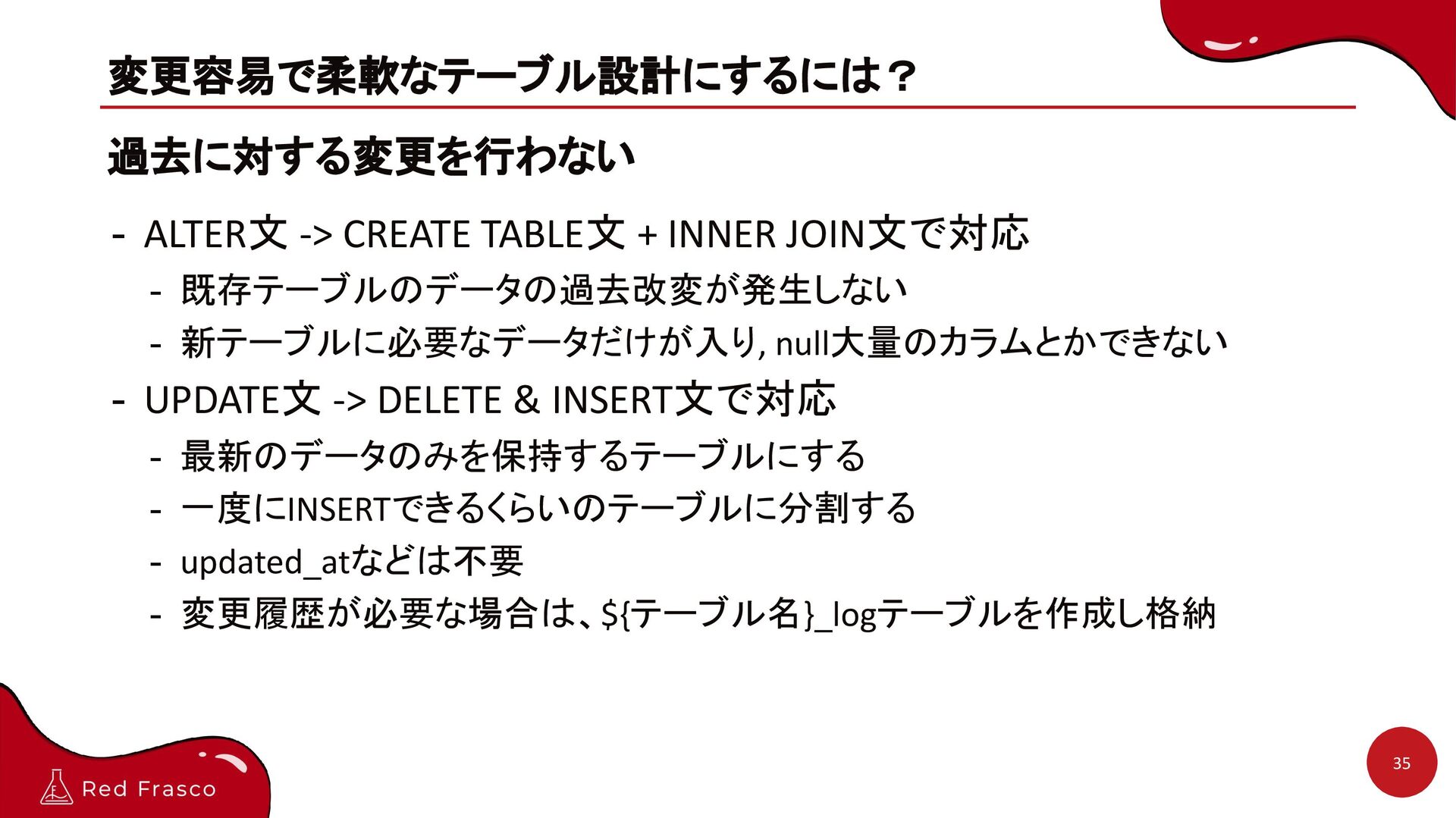 - 既存テーブルのデータの過去改変が発生しない - 新テーブルに必要なデータだけが入り, null大量のカラムとかできない - UPDATE文 -> DELETE & INSERT文で対応 - 最新のデータのみを保持するテーブルにする - 一度にINSERTできるくらいのテーブルに分割する - updated_atなどは不要 - 変更履歴が必要な場合は、${テーブル名}_logテーブルを作成し格納 35