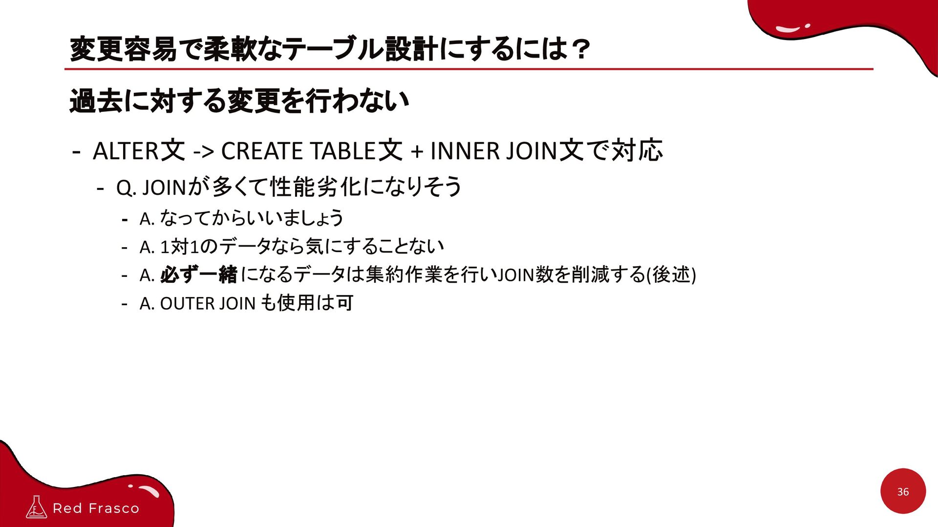 - Q. JOINが多くて性能劣化になりそう - A. なってからいいましょう - A. 1対1のデータなら気にすることない - A. 必ず一緒になるデータは集約作業を行いJOIN数を削減する(後述) - A. OUTER JOIN も使用は可 36
