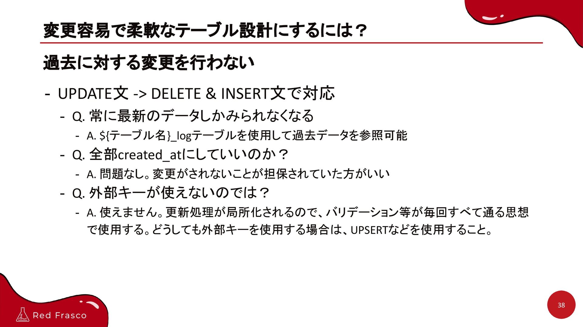 常に最新のデータしかみられなくなる - A. ${テーブル名}_logテーブルを使用して過去データを参照可能 - Q. 全部created_atにしていいのか? - A. 問題なし。変更がされないことが担保されていた方がいい - Q. 外部キーが使えないのでは? - A. 使えません。更新処理が局所化されるので、バリデーション等が毎回すべて通る思想 で使用する。どうしても外部キーを使用する場合は、UPSERTなどを使用すること。 38