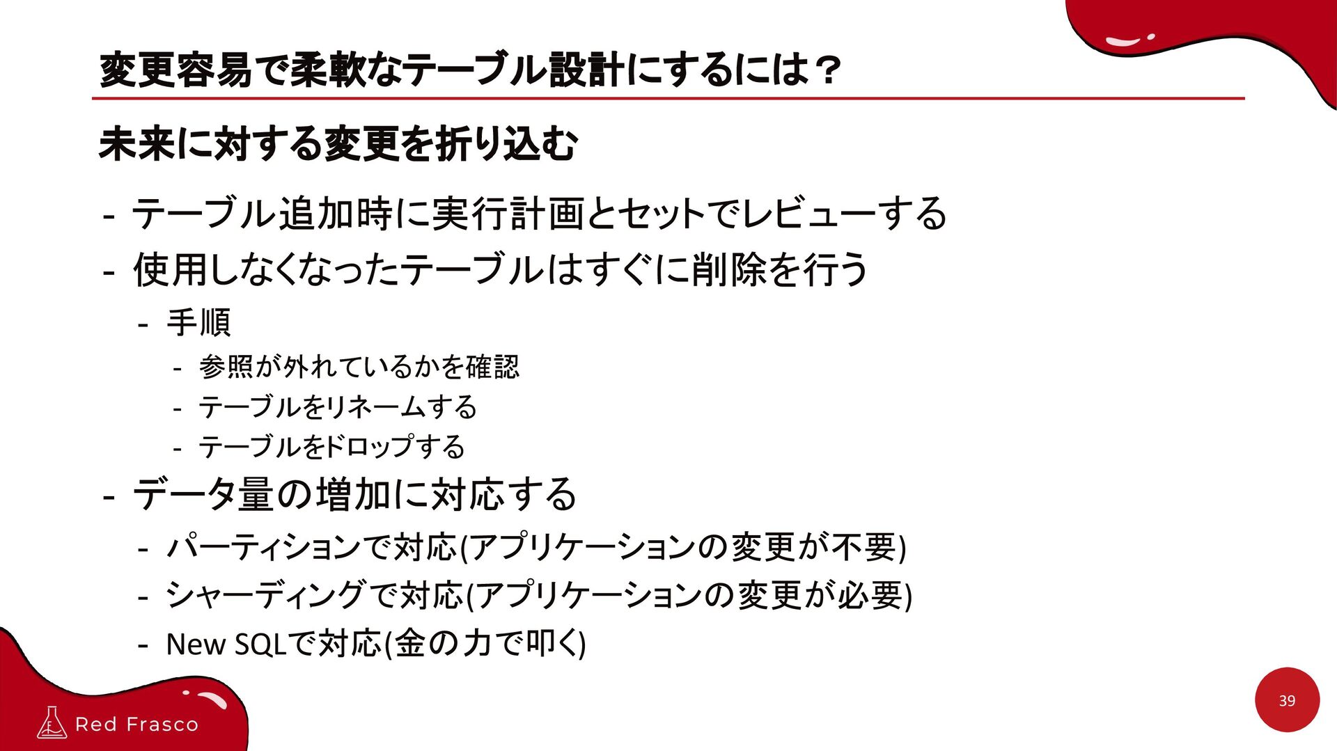 - テーブルをリネームする - テーブルをドロップする - データ量の増加に対応する - パーティションで対応(アプリケーションの変更が不要) - シャーディングで対応(アプリケーションの変更が必要) - New SQLで対応(金の力で叩く) 39