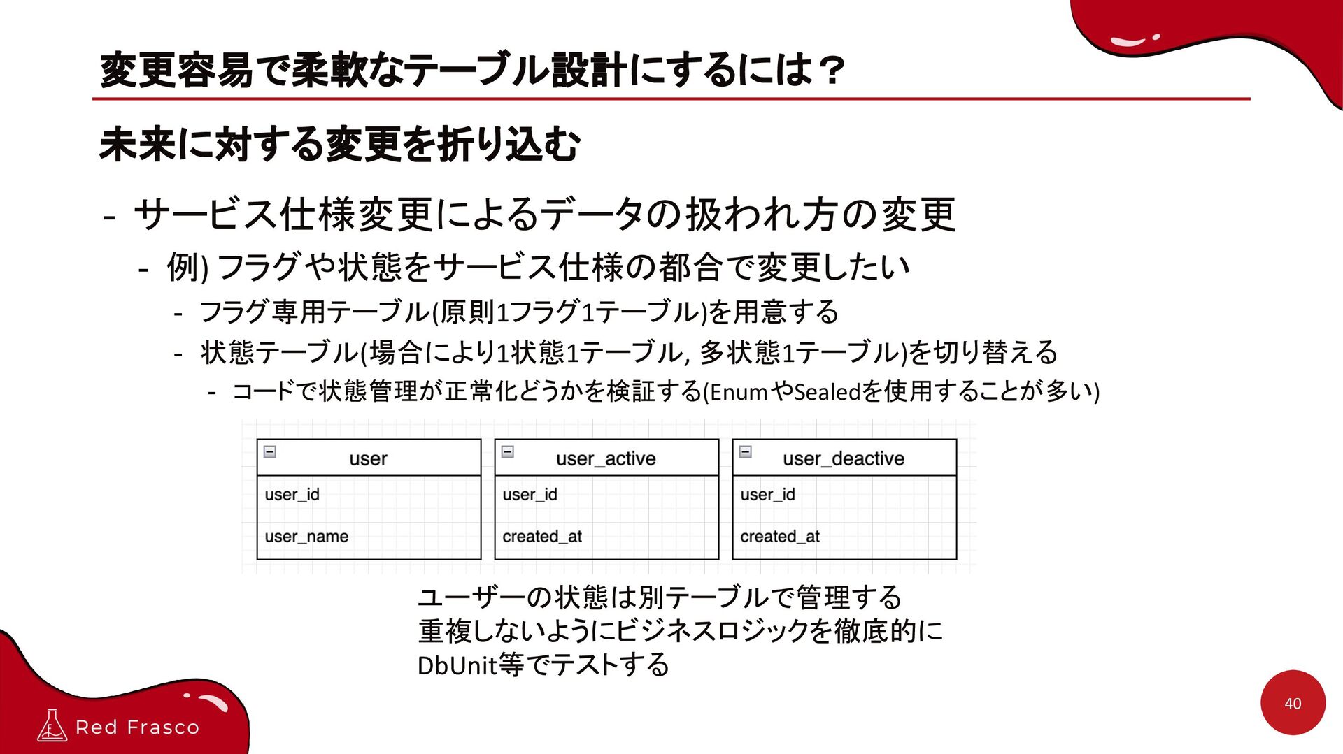 状態テーブル(場合により1状態1テーブル, 多状態1テーブル)を切り替える - コードで状態管理が正常化どうかを検証する(EnumやSealedを使用することが多い) 40 ユーザーの状態は別テーブルで管理する 重複しないようにビジネスロジックを徹底的に DbUnit等でテストする