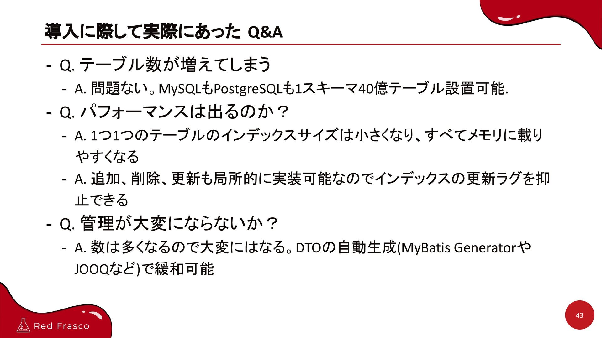 パフォーマンスは出るのか? - A. 1つ1つのテーブルのインデックスサイズは小さくなり、すべてメモリに載り やすくなる - A. 追加、削除、更新も局所的に実装可能なのでインデックスの更新ラグを抑 止できる - Q. 管理が大変にならないか? - A. 数は多くなるので大変にはなる。DTOの自動生成(MyBatis Generatorや JOOQなど)で緩和可能 43
