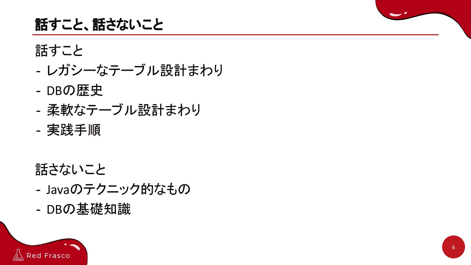 6. レガシーなテーブル設計はなぜ発生するのか? 19 - データが増えなければ、初期設計は良い設計になっている(はず) - 項目が増えなければ、初期設計は良い設計になっている(はず) - 項目追加 = カラム追加の思考