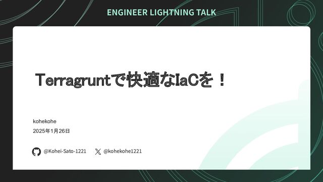Terragruntで快適なIaCを! kohekohe 2025年1月26日 ENGINEER LIGHTNING TALK @Kohei-Sato-1221 @kohekohe1221