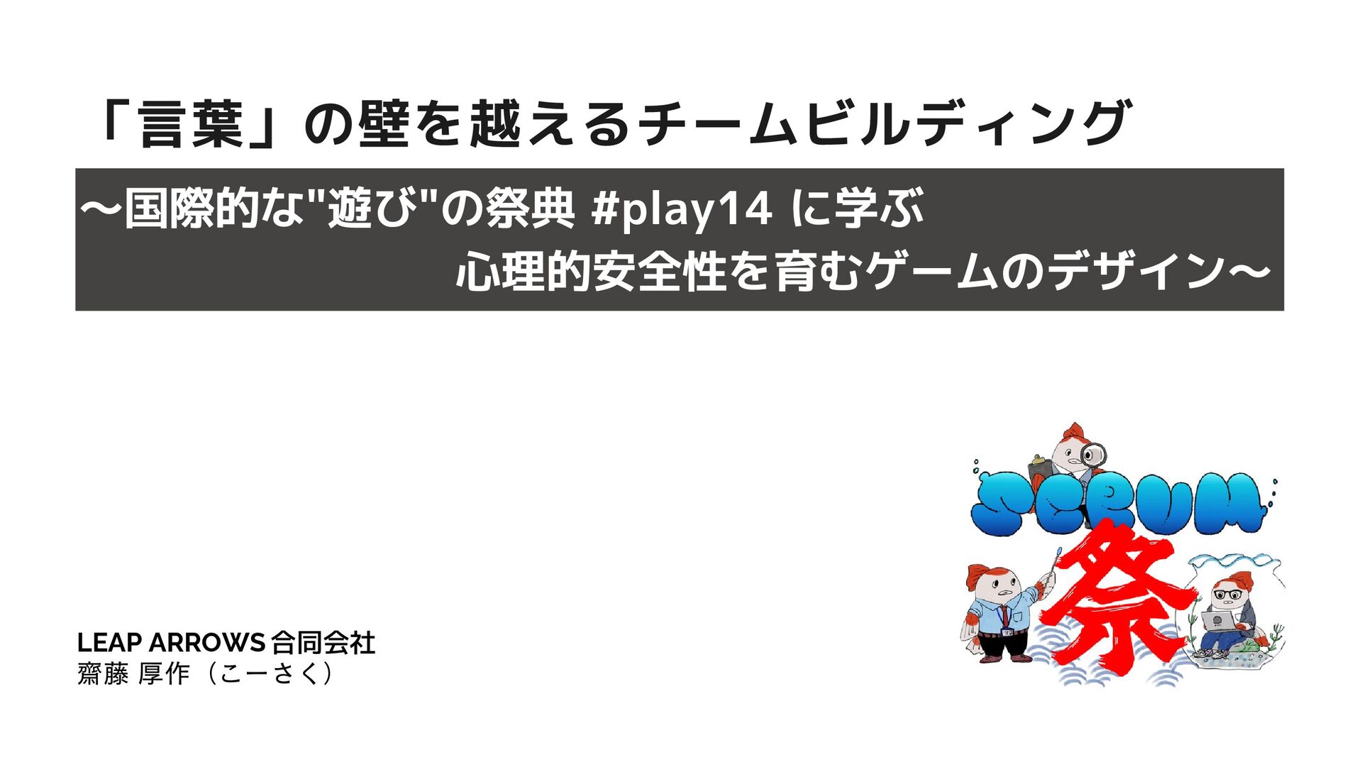 〜国際的な"遊び"の祭典 #play14 に学ぶ 心理的安全性を育むゲームのデザイン〜 「言葉」の壁を越えるチームビルディング 齋藤 厚作(こーさく) LEAP ARROWS 合同会社