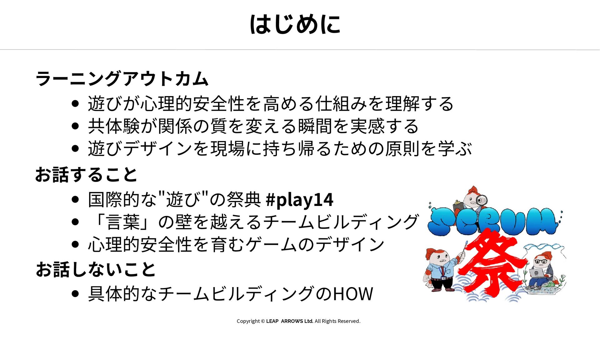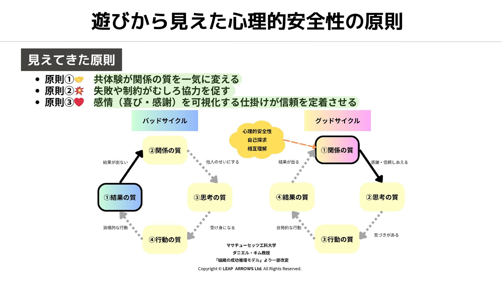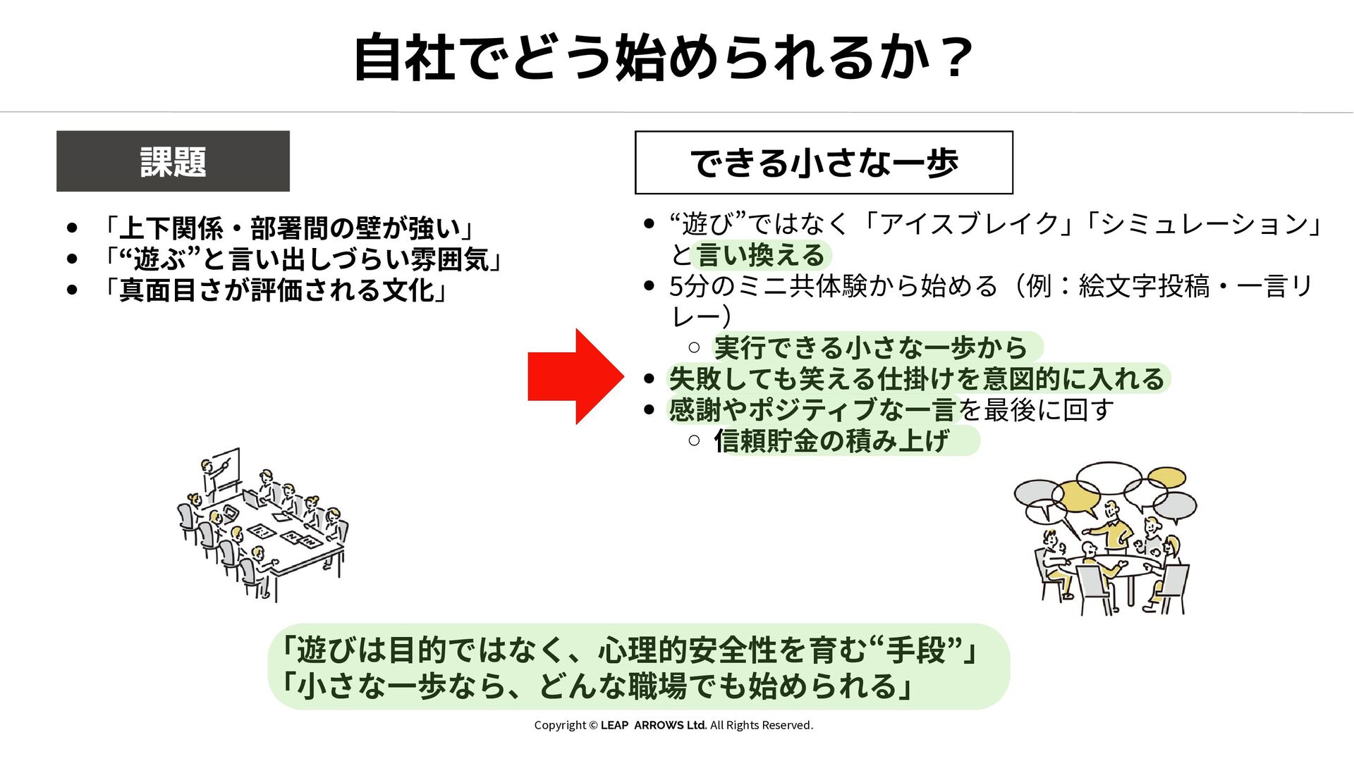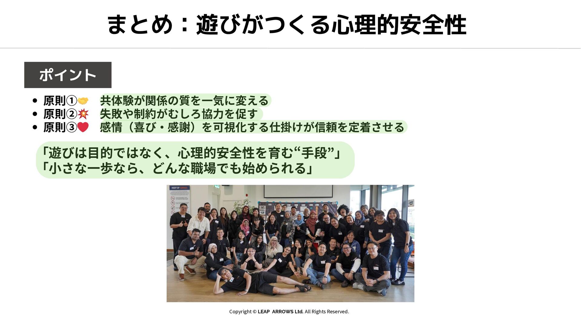ポイント 「遊びは目的ではなく、心理的安全性を育む“手段”」 「小さな一歩なら、どんな職場でも始められる」 Copyright © LEAP ARROWS Ltd. All Rights